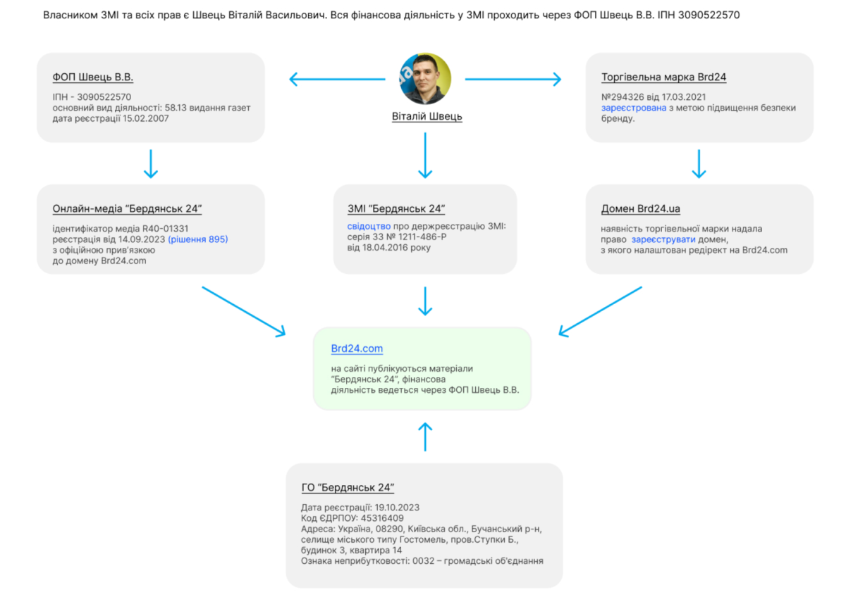 З вересня 2023 року «Бердянськ 24» офіційно зареєстроване як онлайн-медіа Національною радою з питань телебачення і радіомовлення. Ідентифікатор у реєстрі медіа: R40-01331. Засновником онлайн-медіа є ФОП Швець Віталій Васильович (код ЄДРПОУ 3090522570).