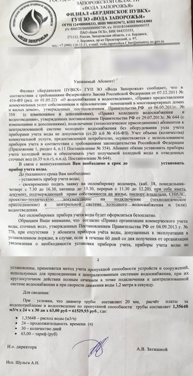 Якщо протягом двох місяців не встановити лічильник, окупаційний водоканал погрожує стягувати плату за окремим тарифом, де куб води вартує 63 рублі. За підрахунками окупаційного комунального підприємства, без оновлених договорів бердянці будуть сплачувати 61,5 тисячу рублів на місяць.