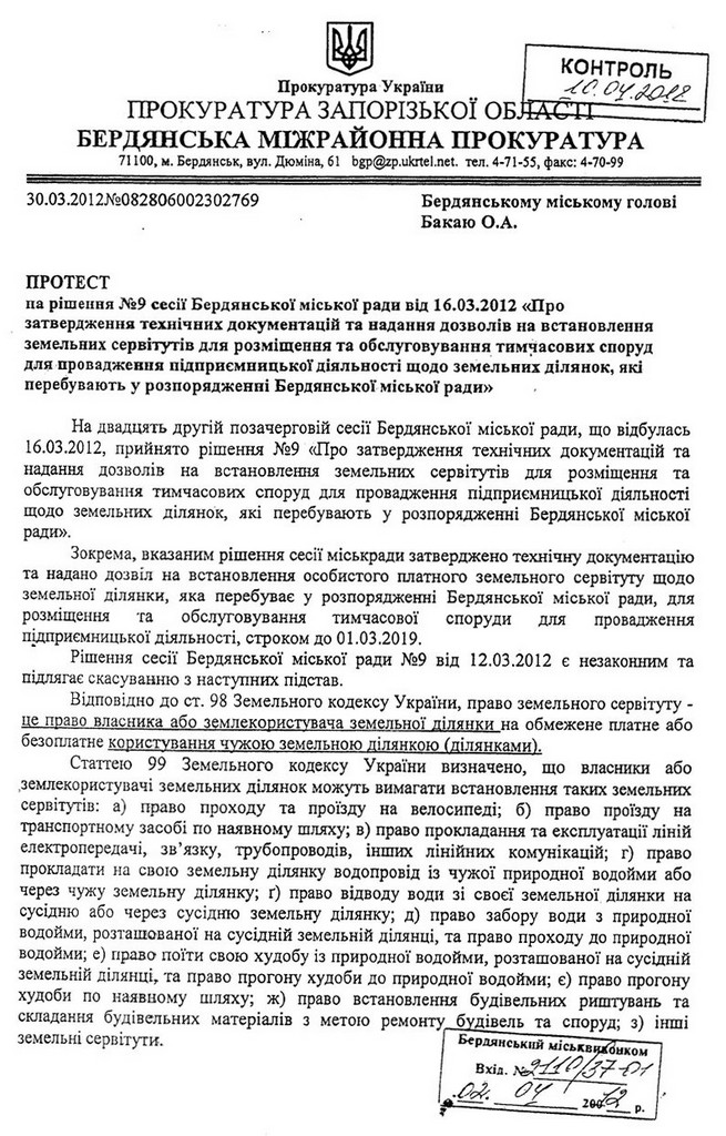 Однако и эта противозаконная попытка господина Безверхого в едином порыве объединить депутатский корпус была пресечена Бердянской межрайонной прокуратурой. Так 30 марта 2012 года Бердянская межрайонная прокуратура выносит протест на незаконное решение Бердянского городского совета от 16.03.2012 года №9 «Об утверждении технических документаций и предоставлении разрешений на установление земельных сервитутов для размещения и обслуживания временных сооружения для осуществления предпринимательской деятельности в отношении земельных участков, которые находятся в распоряжении Бердянского городского совета».