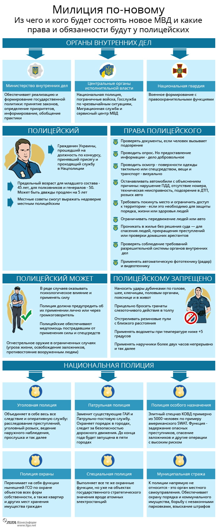 В соответствии с принятыми законами, МВД оставляет за собой в основном политические функции. Основная нагрузка ложится на новый орган – Национальную полицию, в которой будут функционировать пять подразделений: патрульная полиция, уголовная полиция, специальная полиция, полиция охраны и полиция особого назначения. Задачи и принципы работы этих подразделений в законе не расписаны. Из публичных выступлений Авакова и Згуладзе некоторое представление можно составить только о патрульных, которые до конца года должны вытеснить с улиц ППС и гаишников и начать работать в пяти городах-миллионниках: Киеве, Одессе, Львове, Харькове и Днепропетровске.
