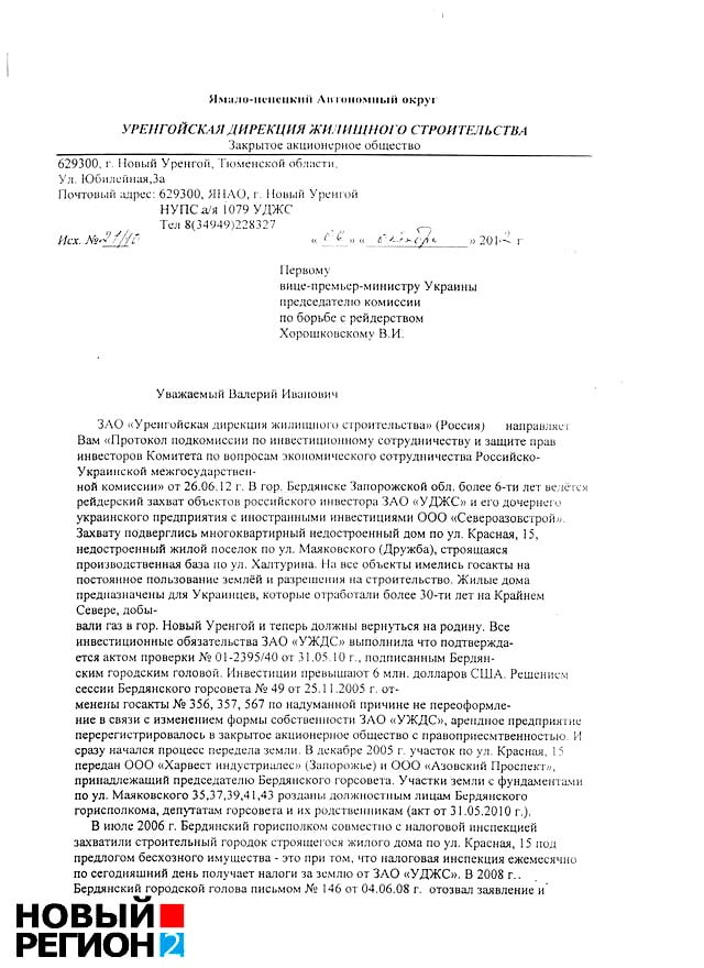 Российская компания «ЗАО Уренгойская дирекция жилищного строительства» и ее дочернее предприятие на Украине ООО «Североазовстрой» вот уже более 20 лет работает в Бердянске. За это время российскими инвесторами в развитие инфраструктуры города были вложены немалые средства. Построен глубоководный канализационный коллектор, длиной 2,5 км, бесплатно обеспечены жильем бердянские милиционеры, приобретено 6 тыс. тонн труб для водовода Днепр-Бердянск, который почетно открывал Виктор Янукович, будучи еще премьер-министром Украины.