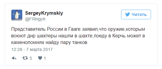 Первый вице-спикер ВР Ирина Геращенко заявила у себя в Facebook: “В Международном суде ООН в Гааге россияне заявили, что оружие лежало в шахтах. Согласно этой логике, там лежал и Бук, из которого сбили малазийский Боинг … в шахтах лежат новейшие Грады, Буратино и другое смертоносное оружие, поэтому в шахты не пускают миссию СММ ОБСЕ”.