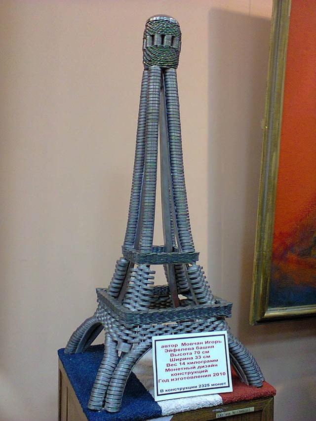 Автор презентовал шесть скульптур, которые сделаны из…денег! Игорь сотворил мини-копии знаменитых памяток архитектуры из мелких монет, которые все мы, как правило, не берем на сдачу в супермаркетах. Лишь над одним проектом мастер трудится целый год: старательно склеивает копейку к копейке специальным клеем, сделанным под заказ. Работы довольно тяжелые и на создание каждой уходит несколько тысяч копеек. К примеру, Пизанская башня весит 12 килограммов и состоит почти из восьми тысяч монет. Представленные работы – это только начало. Сейчас у него почти готов разрушенный Колизей, в планах создание Кремлевской стены.