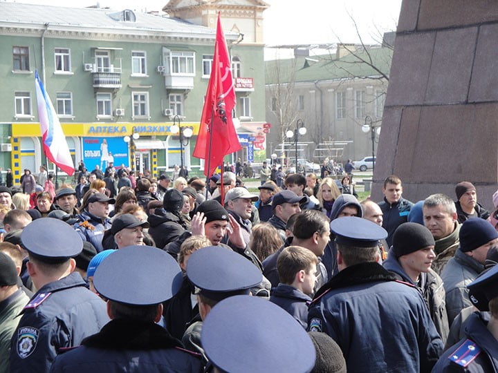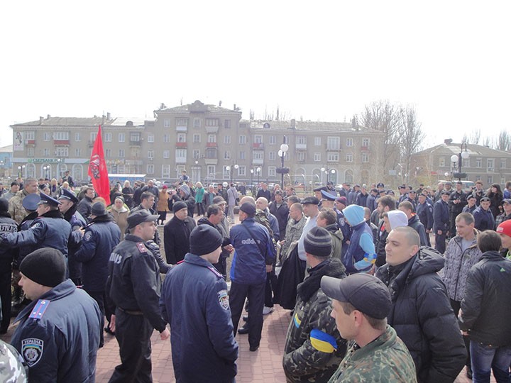 Участников политических акций живым щитом разделяли правоохранители – сотрудники горотдела милиции и патрульного батальйона, в общей сложности более 30-ти человек. Первый час митингов прошел без эксцессов – около двух сотен человек под флагами РФ, Крыма, Русского единства и коммунистической партии выступали против евроинтеграции, в очередной раз заявляли, что не признают действующую власть и требовали проведения референдума. Как ни странно, дирижировал этим митингом Игорь Маманазаров, которого, по предварительной информации, ранее задержало СБУ. Представили Бердянского майдана, около ста человек, снова заявили о недопустимости федерализации Украины и осудили сепаратизм. После, растянув 10-ти метровый украинский флаг, бердянские патриоты торжественно прошли по центральной части города и вернулись под здание горисполкома, дабы не допустить его захвата пророссийско настроенными гражданами.
