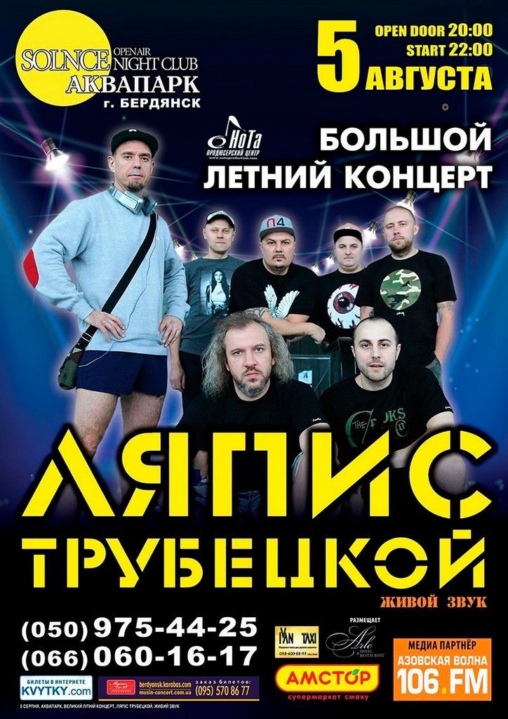Слухи о концерте легендарной группы в Бердянске ходили уже достаточно давно, и сегодня, на официальном сайте группы “Ляпис Трубецкой” появилась информация о проведении концерта в Бердянске. В рамках прощального тура с поклонниками, 5 августа в Бердянском аквапарке пройдет большой летний концерт группы.