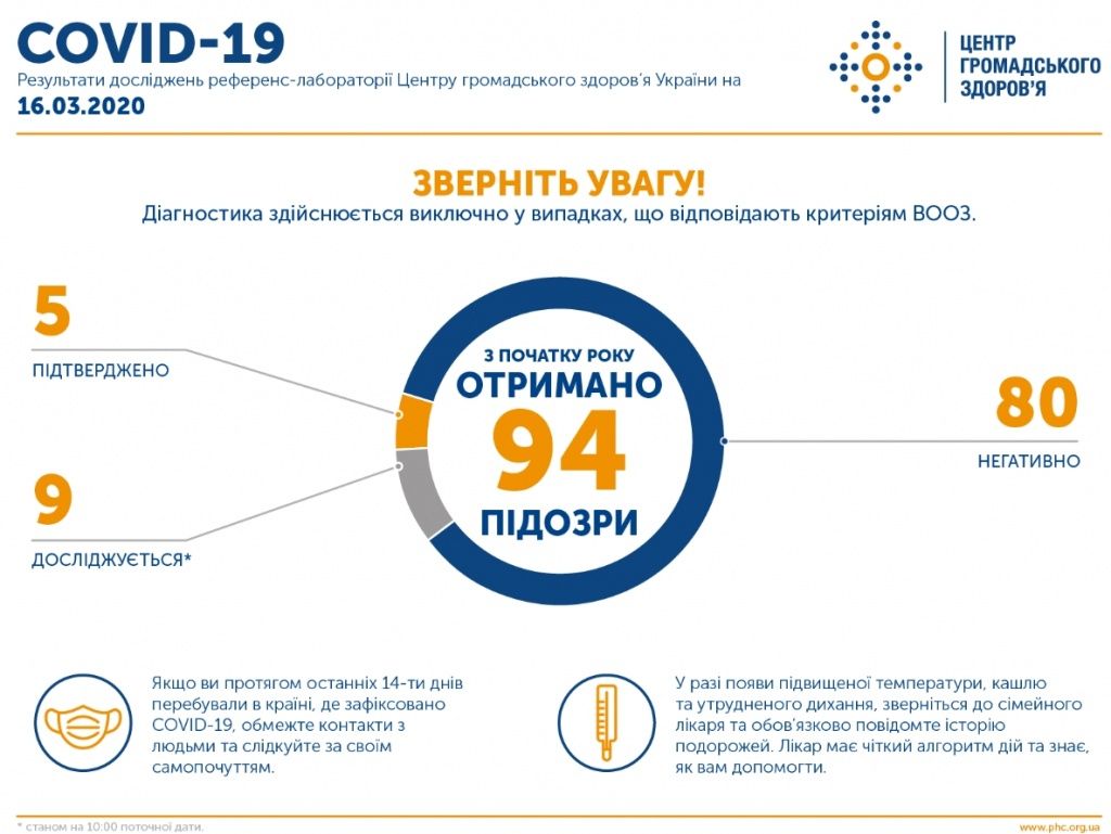 В Україні станом на 9:30 16 березня лабораторно підтверджено 5 випадків Covid-19