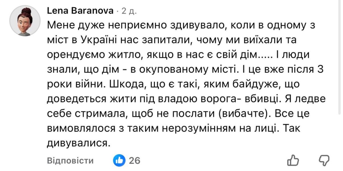 «Мені дуже неприємно здивувало, коли в одному з міст в Україні нас запитали, чому ми виїхали та орендуємо житло, якщо в нас є свій дім… І люди знали, що дім – в окупованому місті».