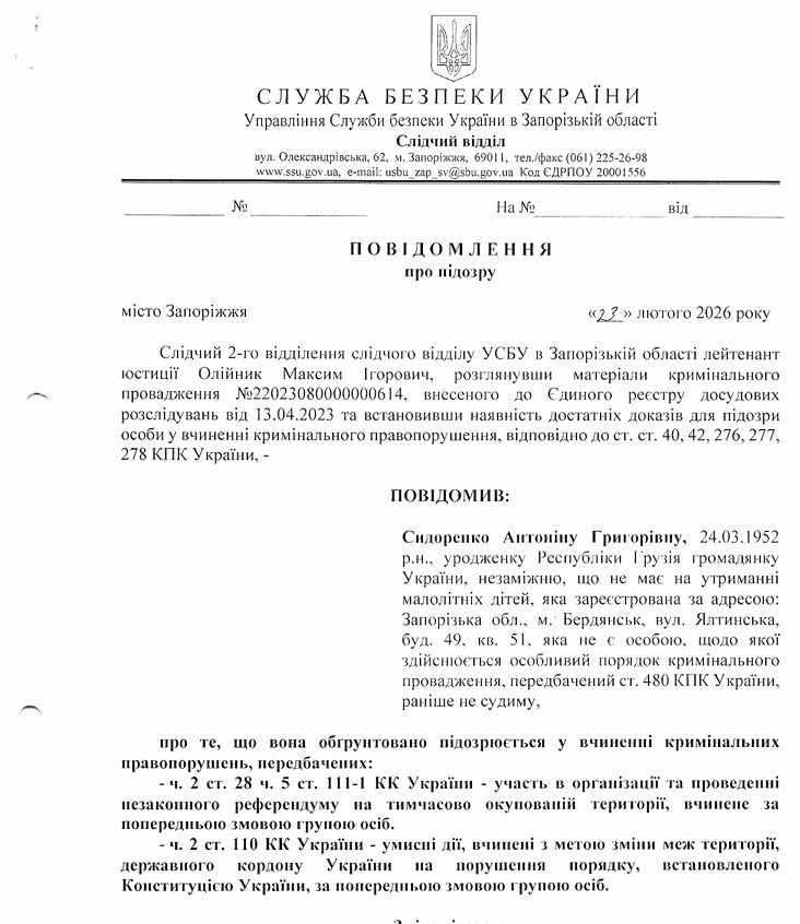 Проти бердянки порушили кримінальну справу за ч. 2 ст. 110 КК України – умисні дії, вчинені з метою зміни меж території, державного кордону України на порушення порядку, встановленого Конституцією України, за попередньою змовою групою осіб.