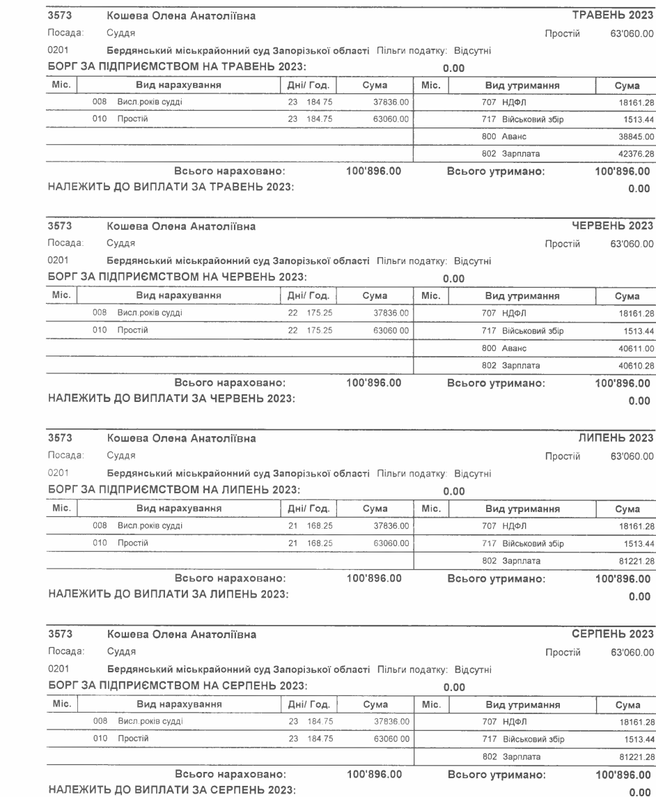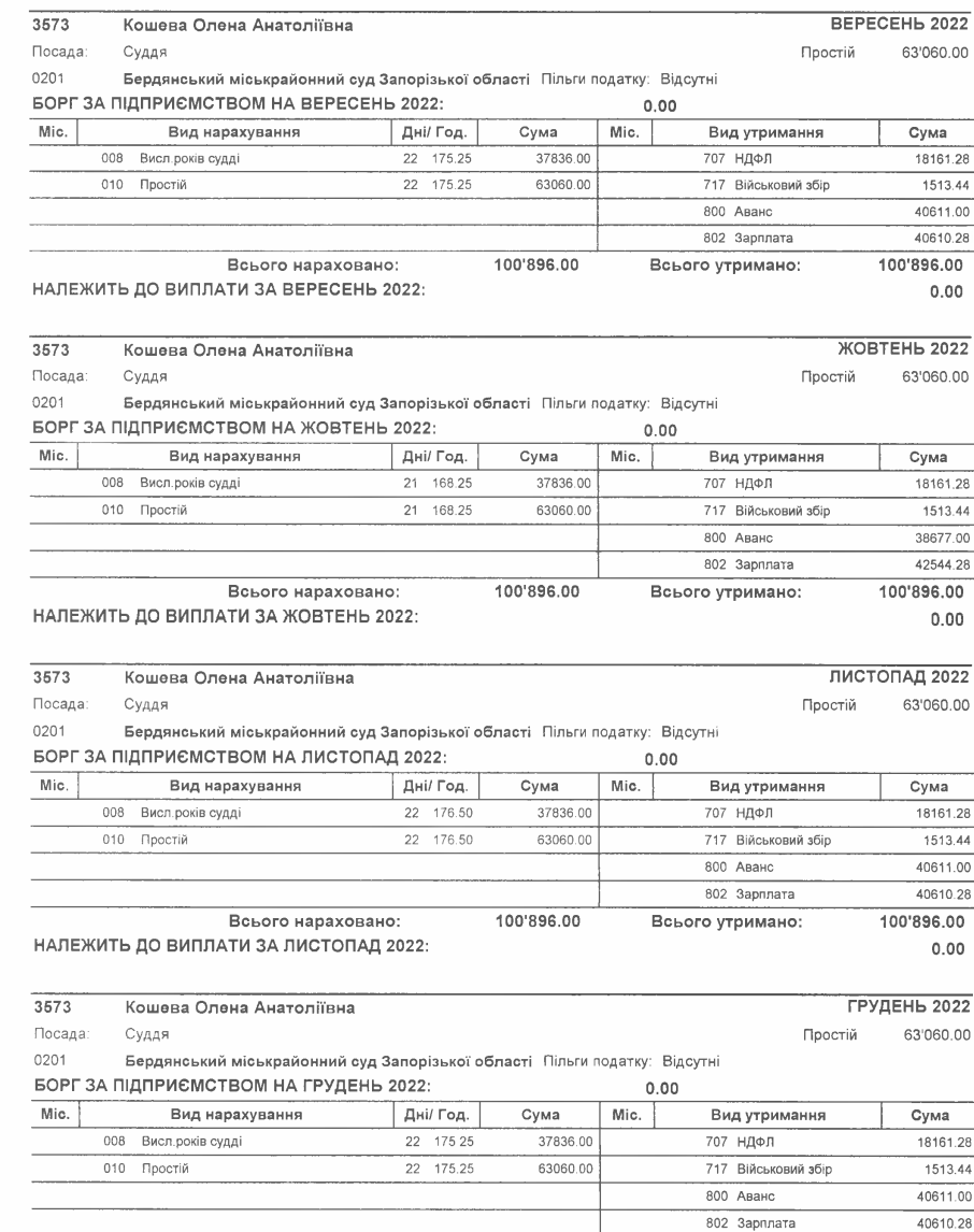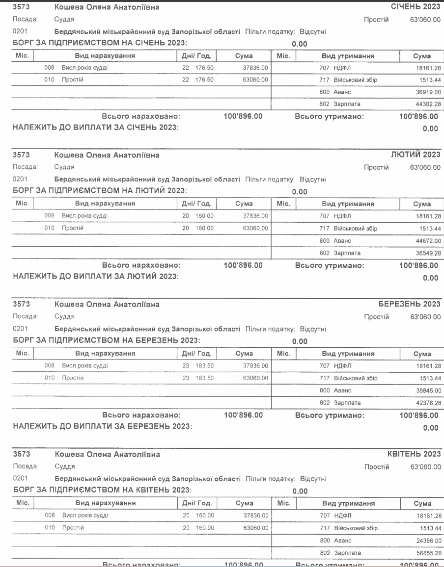 Територіальне управління ДСА в Запорізькій області надало «Бердянськ 24» копії розрахункових листів судді Бердянського міськрайонного суду Олени Кошевої за період із січня 2022 року по вересень 2023-го. Із цих документів випливає, що після початку простою, з квітня 2022 року по вересень 2023-го, їй щомісяця нараховували 100 896 грн суддівської винагороди. Після сплати ПДФО та військового збору це становило 81 221,28 грн на місяць. У березні 2022 року сума на руки була трохи більшою – 82 752,86 грн.