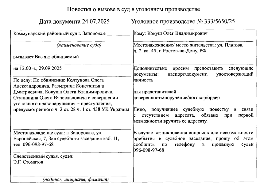 6 квітня 2026 року Комунарський районний суд Запоріжжя визнав чотирьох росіян Олега Колтунова, Костянтина Разигріна, Олега Кокуша й Олега Ступішина винними у порушенні законів і звичаїв війни. Кожен з них отримав вирок – 12 років ув’язнення. Відбування покарання почнеться після фактичного затримання.
