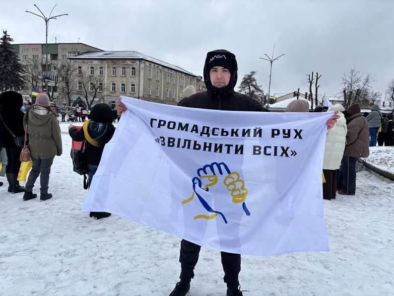 Бердянець Олександр морпіх, який повернувся з полону в квітні 2025 року. Він потрапив туди під час оборони Маріуполя. Чоловік зазначив, що разом із громадським рухом звільнених їздить на всі такі акції.