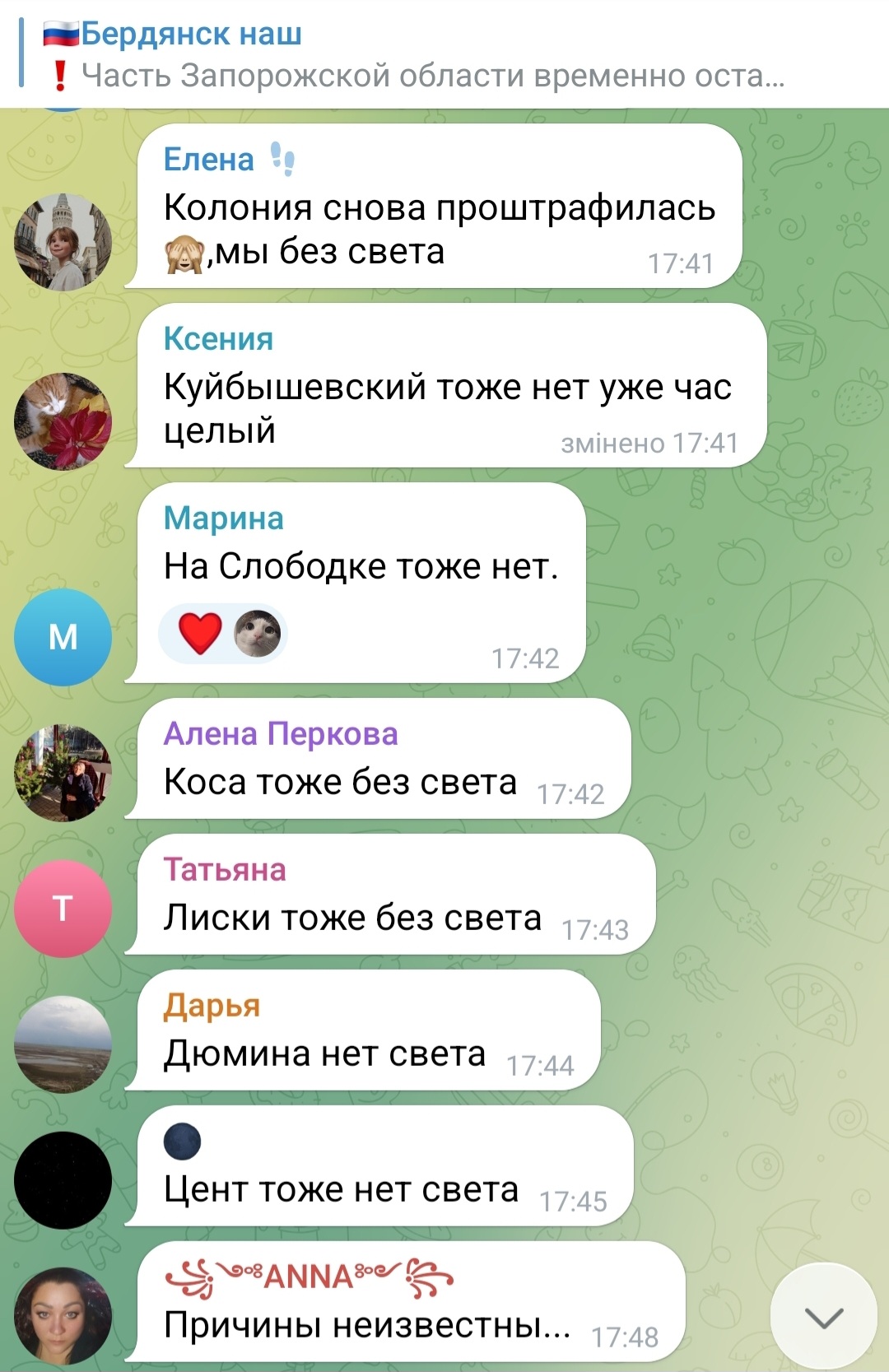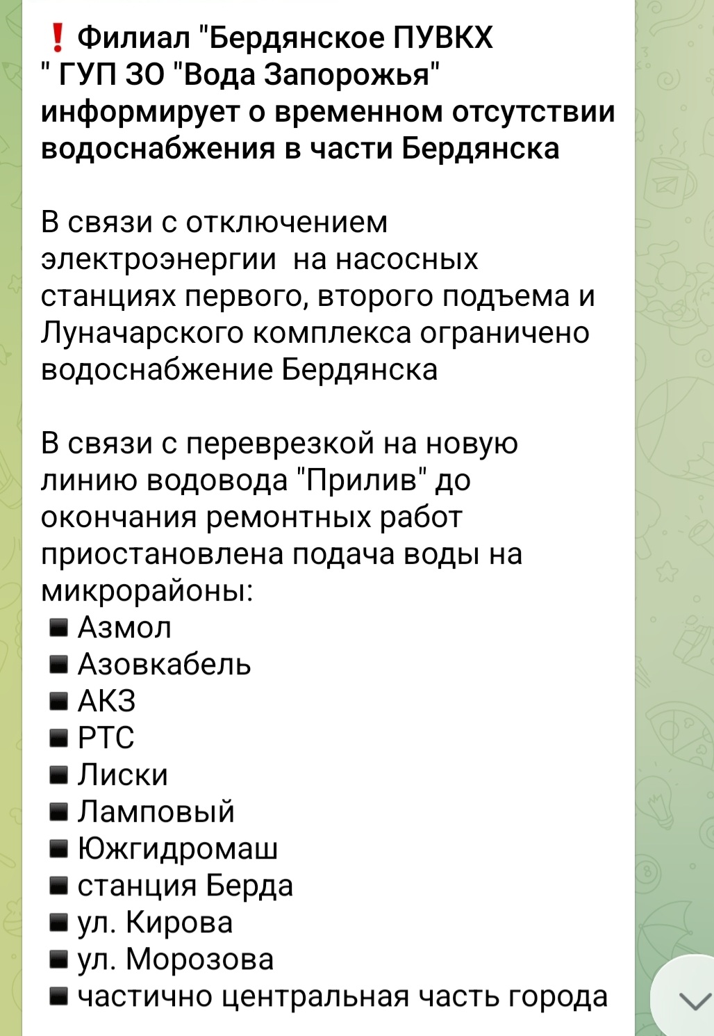 Водночас через відключення світла на насосних станціях, вчора у Бердянську обмежили водопостачання. 19 січня повідомили про аварійну зупинку водоводу «Приплив» . Через це без води весь мікрорайон Військове містечко, люди почали зливати її з батарей. Комунальники закликають не робити цього, бо котельня може зупинити роботу. Однак у кількох мікрорайонах повідомляють, що тепла немає вже три дні, а в квартирах 6 градусів тепла.