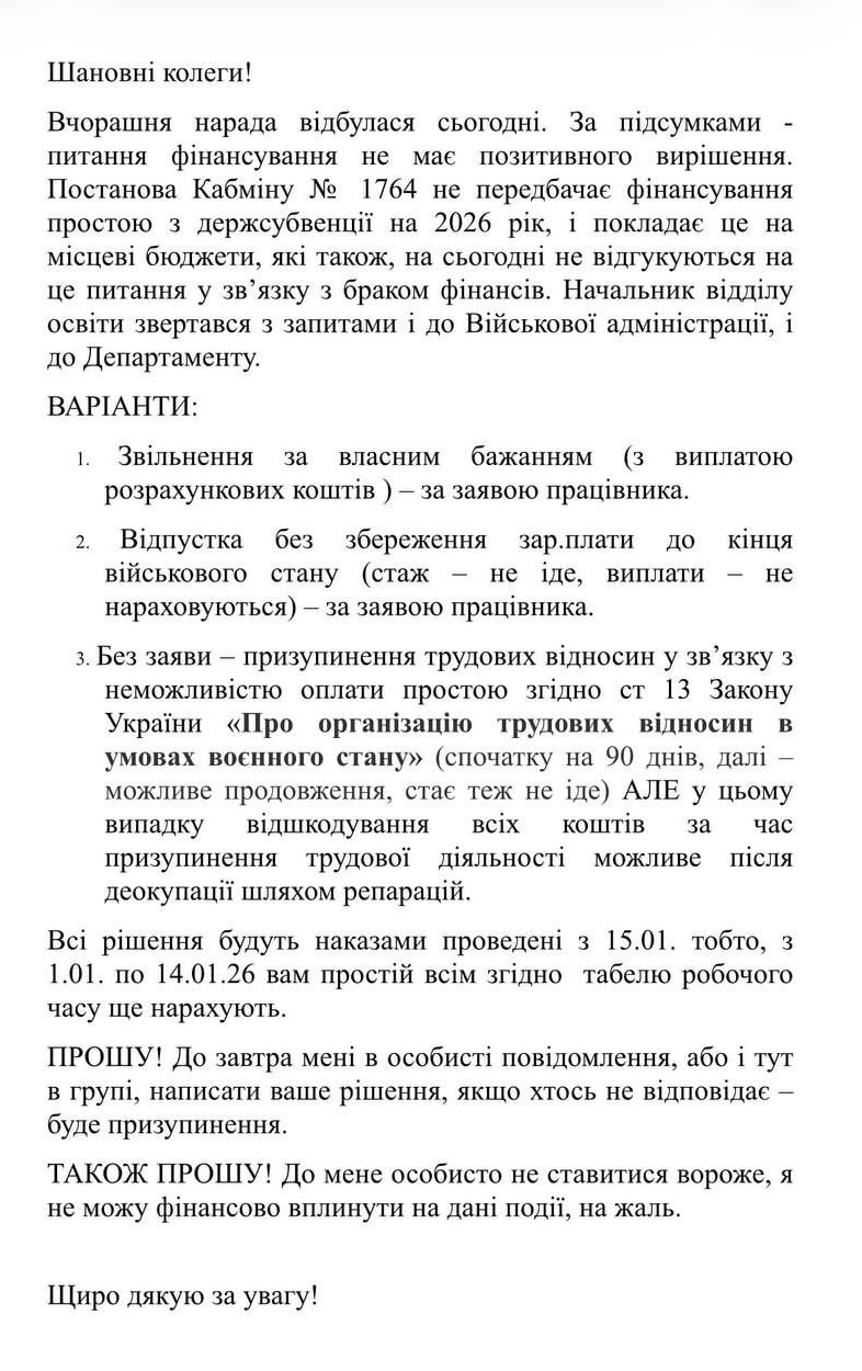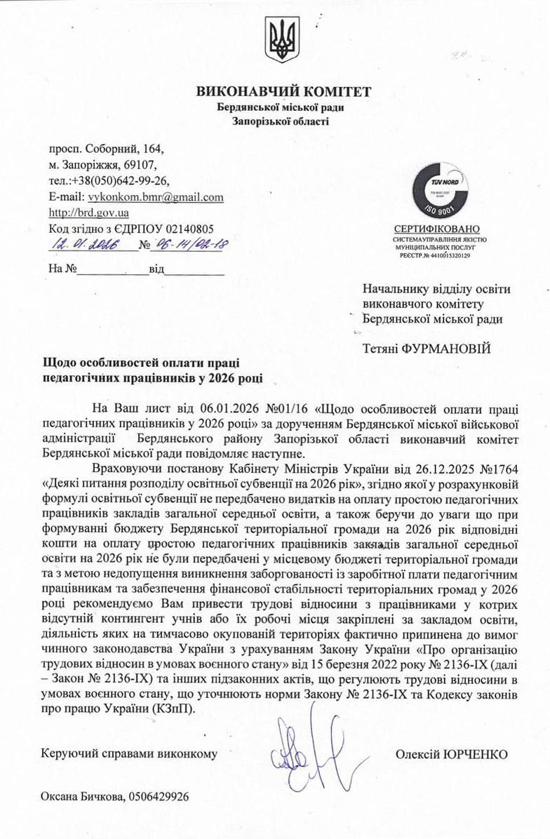 До редакції «Бердянськ 24» потрапили документи, які підтверджують цілеспрямоване скорочення педагогічного складу. Бердянський міськвиконком повідомив начальника відділу освіти Тетяну Фурманову, що ані в державному, ані в місцевому бюджетах не закладені гроші на зарплату викладачів «на простої». Міська влада послалася на Постанову Кабміну №1764 та рекомендувала відділу освіти навести лад у трудових відносинах. Тож бердянським вчителям «на простої» запропонували три варіанти: звільнення за власним бажанням, відпустку без збереження зарплати до кінця військового стану чи призупинення трудових відносин.
