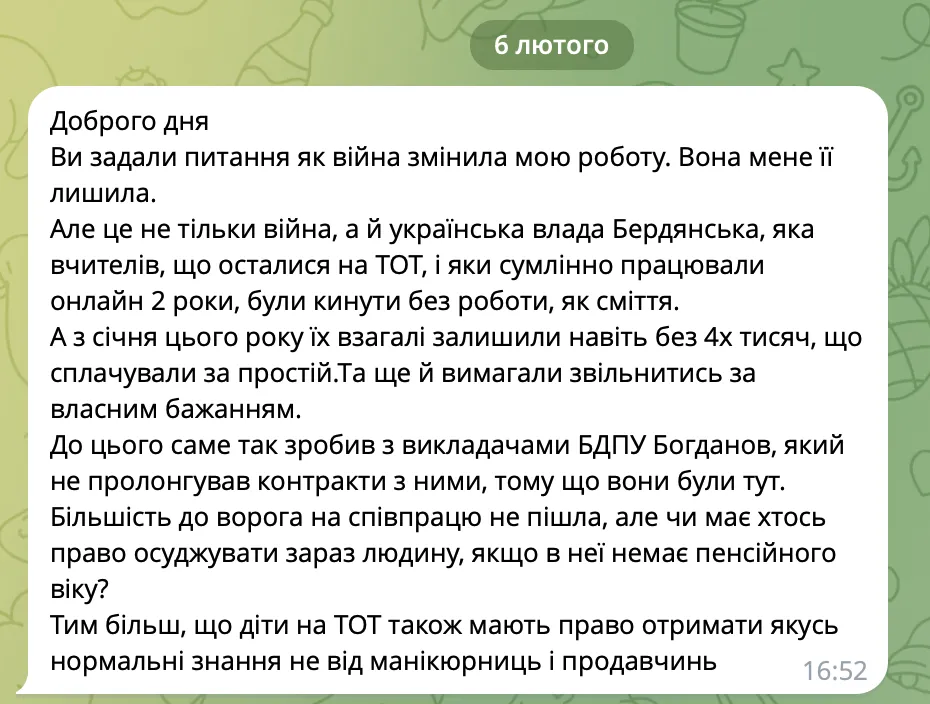 Редакція «Бердянськ 24» отримала лист від читачів щодо скорочення освітян у навчальних закладах. Зокрема йдеться про вчителів «у простої», які залишились в окупованому місті. Також повідомляють, що викладачів схиляли звільнятися «за особистим бажанням».