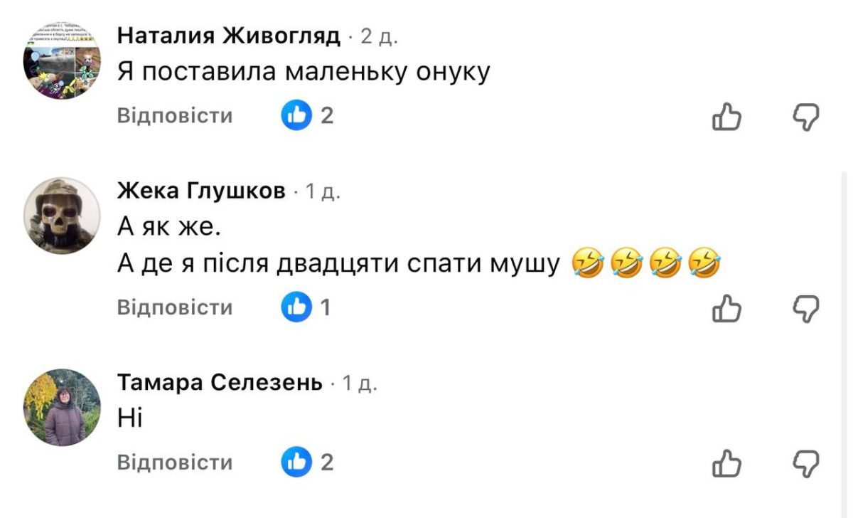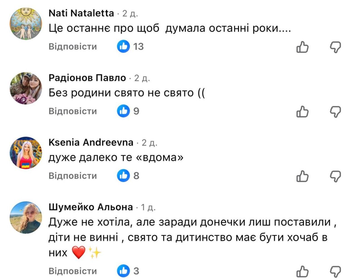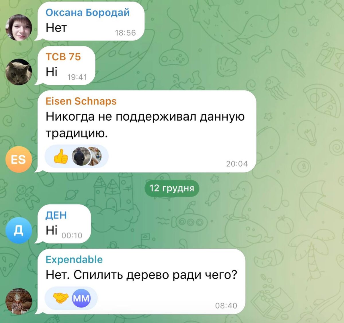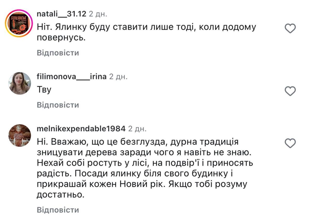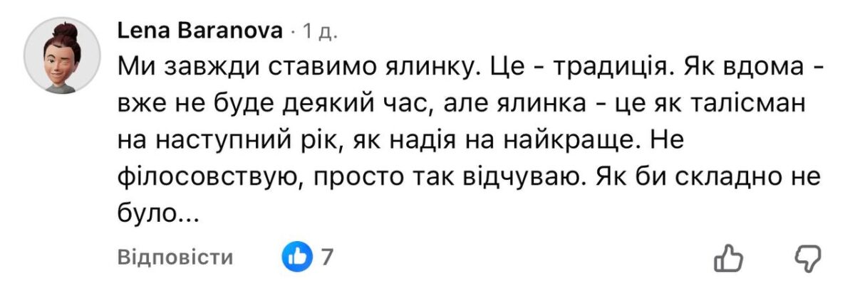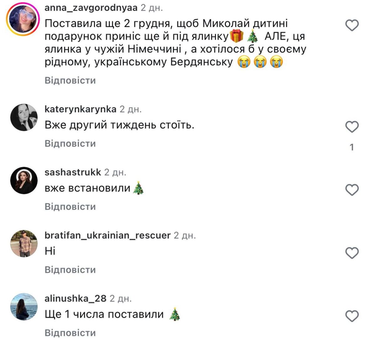 Бердянка Наталія пише, що ялинку планує ставити лише коли повернеться додому, до Бердянська. До неї доєднуються й інші земляки, які вважають, шо ялинка в орендованій оселі та під час війни є недоречною та зайвою. Одна з бердянок анонімно поділилась своєю думкою: