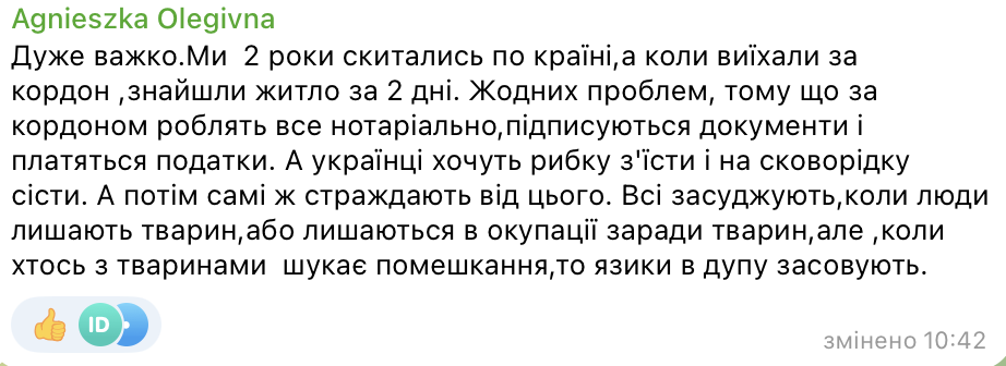 Олександра також приєднується до коментрів. Пише, складно, але ім з родиною пощастило, бо власником квартири виявився ветеринар.