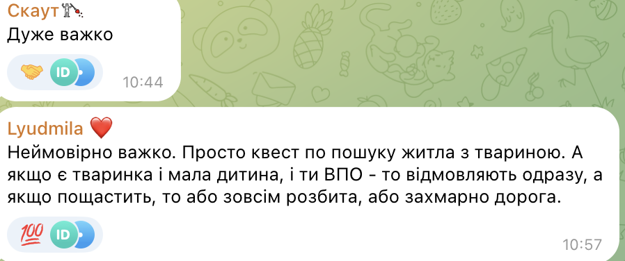 Так, це дуже важко. У нас два кота та невелика собачка, ми їх не кинули напризволяще, всюди з ними возимось, але при пошуку житла нас деякі просто конкретно посилали. Кажуть, молодці, що не кинули, але здавати житло таким не хочуть. Житло у нас недороге, але, м’яко кажучи, не дуже в гарному стані, та ми намагаємось не завдавати проблем, щоб нас не виставили з нашими пухнастиками, бо шукати інше житло стає дедалі важче.
