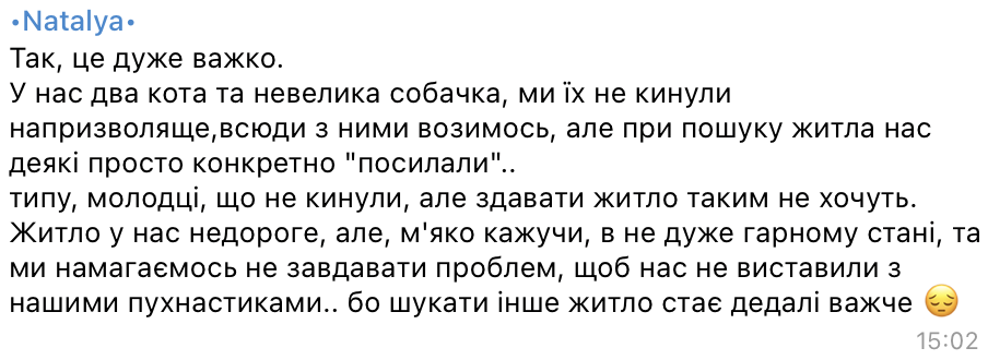 Ще одна бердянка Наталія також ділиться своїм сумним досвілом пошуку житла з тваринкою: