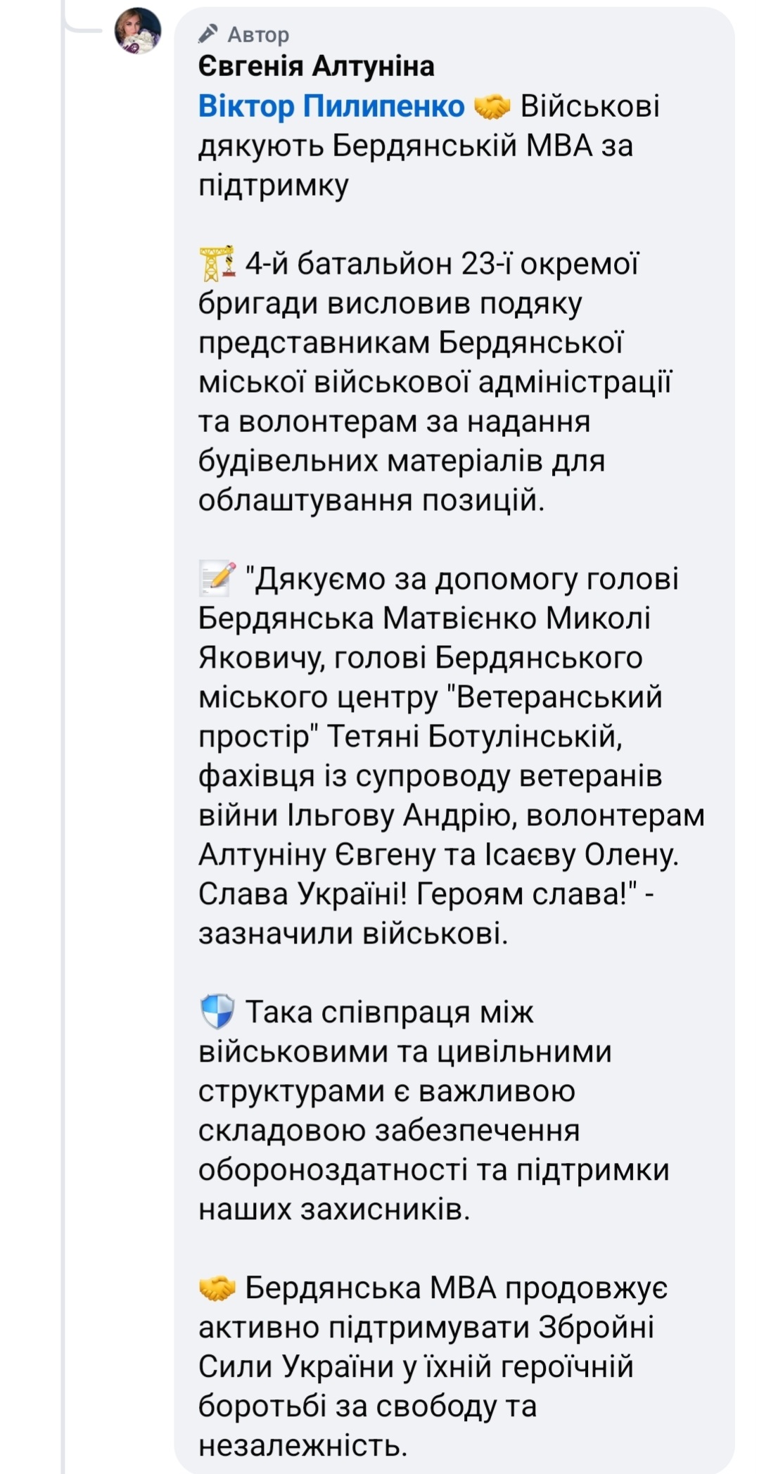 Щоб з’ясувати чи дійсно військова адміністрація привласнила собі чужі «лаври», «Бердянськ 24» звернувся до них за коментарем. Як нам відповіли в БМВА, прохання військових про допомогу в будівельних матеріалах передали одразу до керівництва, Бердянського міського терцентру соціальних служб, а також громадських організацій і волонтерів. Тож поміч почали збирати «з рідних джерел». Там запевнили, що сталася організаційна накладка та спрацював людський фактор.