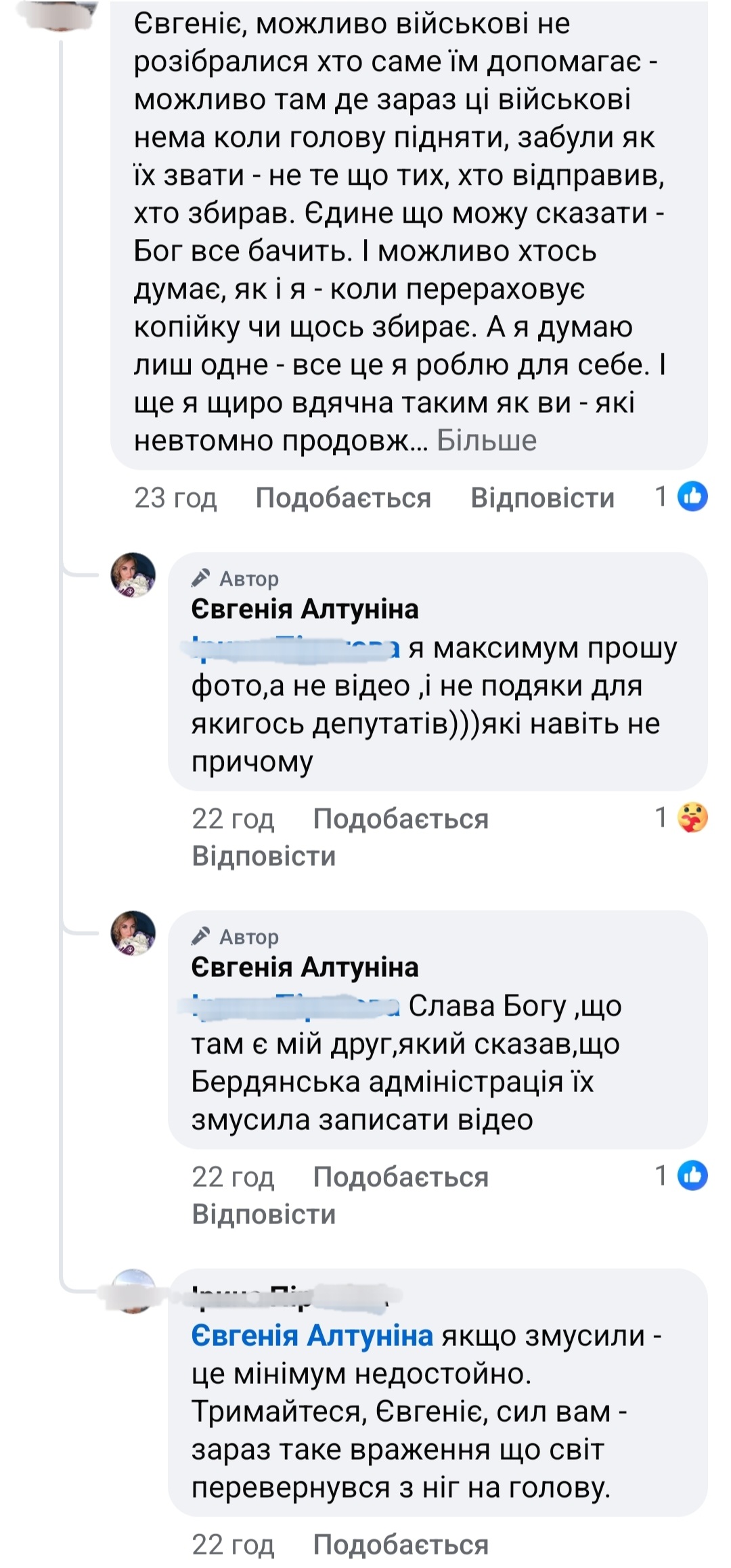 «Директор «Епіцентру» дав нам знижки, ми відправили все хлопцям через «Нову пошту», використали промокоди, все прозоро. А потім я заходжу в інтернет і бачу подяки… не нам, не дітям, які замість канікул стояли на вулиці, а голові Бердянська Матвієнку Миколі Яковичу, Тетяні Богульській та Андрію Ільгову, які взагалі не причетні до цього збору. Більше того, самі військові, які зверталися до «фахівця» Андрія, були направлені… до мене, волонтера Євгенії Алтуніної. І це не один випадок. То в чому «робота» цих людей? Присвоювати собі працю простих волонтерів і наших дітей? Чому пам’ять про Героїв не вшановують, а чужу допомогу приписують собі?», – написала жінка.