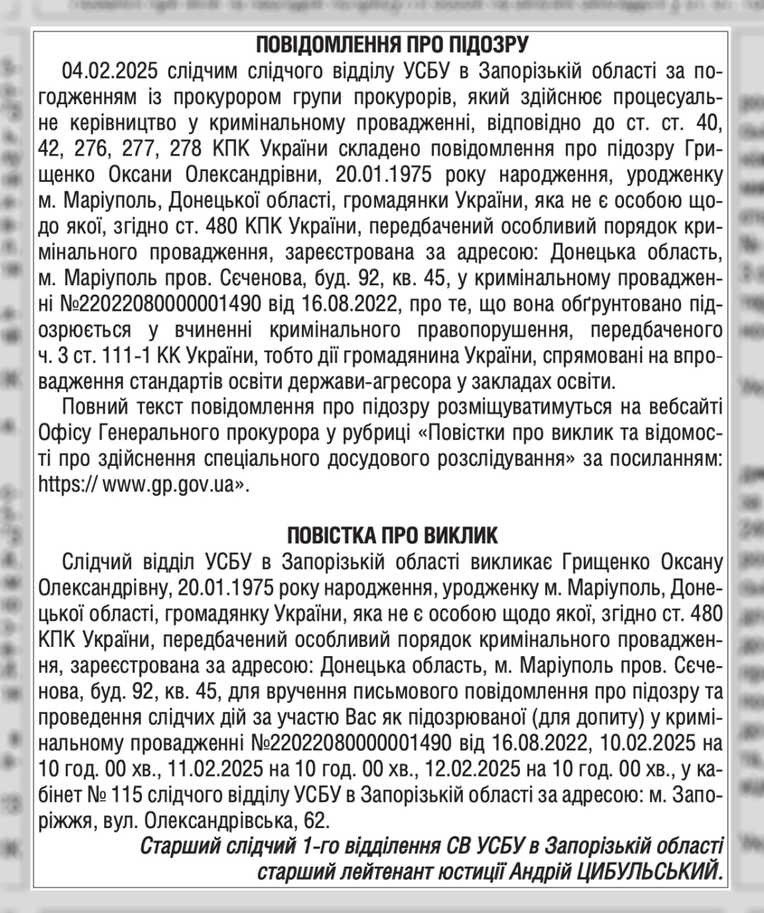 Слідчий відділ УСБУ в Запорізькій області повідомив про підозру Оксані Грищенко, директорці Бердянського медичного коледжу. За даними слідства, після тимчасової окупації Бердянська вона допомагала запроваджувати в навчальному закладі освітні програми країни-агресора. Про це «Бердянськ 24» дізнався з оголошення в газеті «Урядовий кур`єр».