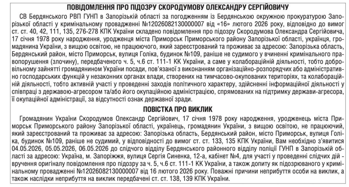 В лютому українська прокураторуа порушила проти Олександра Стародумова кримінальну справу. Йому оголосили про підозру в колабораційній діяльності. А саме добровільному зайнятті посади, пов’язаної з виконанням організаційно-розпорядчих або адміністративно-господарських функцій у незаконних органах влади рф, створених на ТОТ, активній участі у проведенні заходів політичного характеру, здійсненні інформаційної діяльності спільно з державою-агресором. Про це «Бердянськ 24» стало відомо з повідомлення в Урядовому кур’єрі.