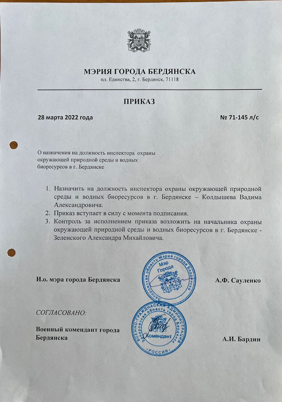 Відомо, що 28 березня 2022 року Колдишев добровільно зайняв посаду інспектора окупаційної охорони навколишнього природного середовища та водних біоресурсів. Він чергував і контролював заборону лову під українським прапором, а також передачу виловлених водних біоресурсів на пункт прийому окупантів. Про це «Бердянськ 24» дізнався з судового вироку.