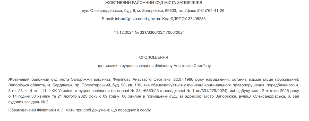 Олександрівський районний суд Запоріжжя визнав Анастасію Філіппову винною в колабораційній діяльності.