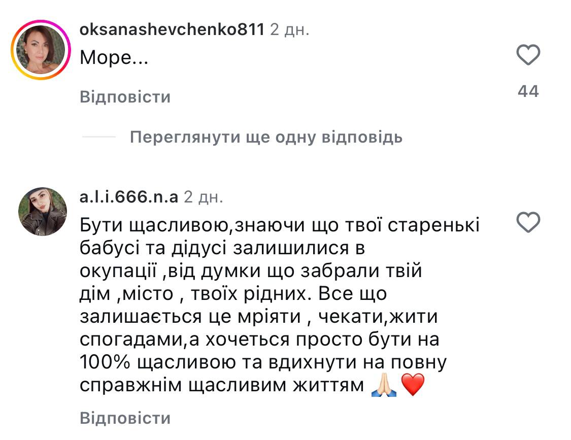 «Бути щасливою, знаючи, що твої старенькі бабусі та дідусі залишились в окупації, від думки, що забрали твій дім, місто, рідних. Все, що залишається – це мріяти, чекати, жити спогадами, а хочеться просто вдихнути на повну й жити справжнім щасливим життям», – написала дівчина.