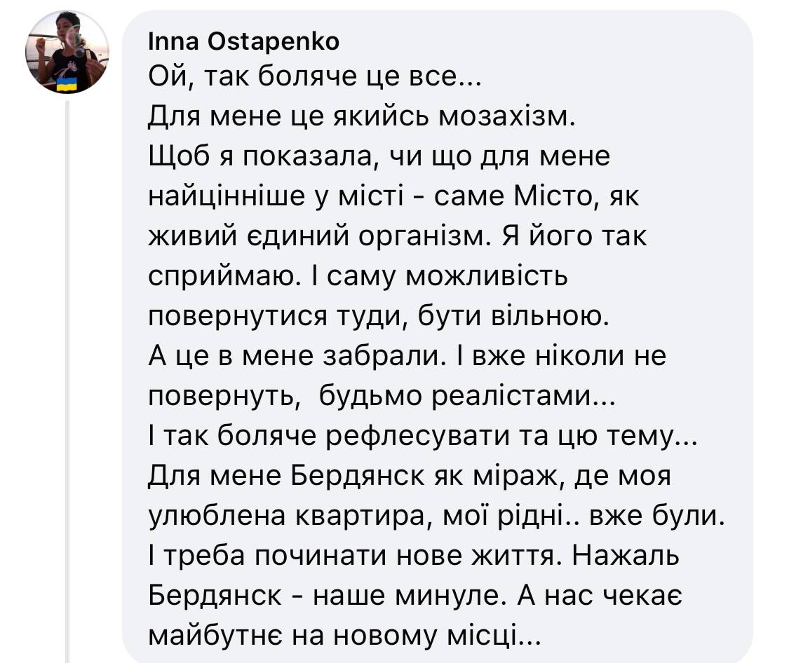 «Ой, так боляче це все… Для мене Бердянськ – як живий організм. Я його так сприймаю. А саму можливість повернутися туди, бути вільною, у мене забрали… Для мене Бердянськ як міраж, де моя улюблена квартира, мої рідні… вже були. Треба починати нове життя. На жаль, Бердянськ – наше минуле. А нас чекає майбутнє на новому місці».