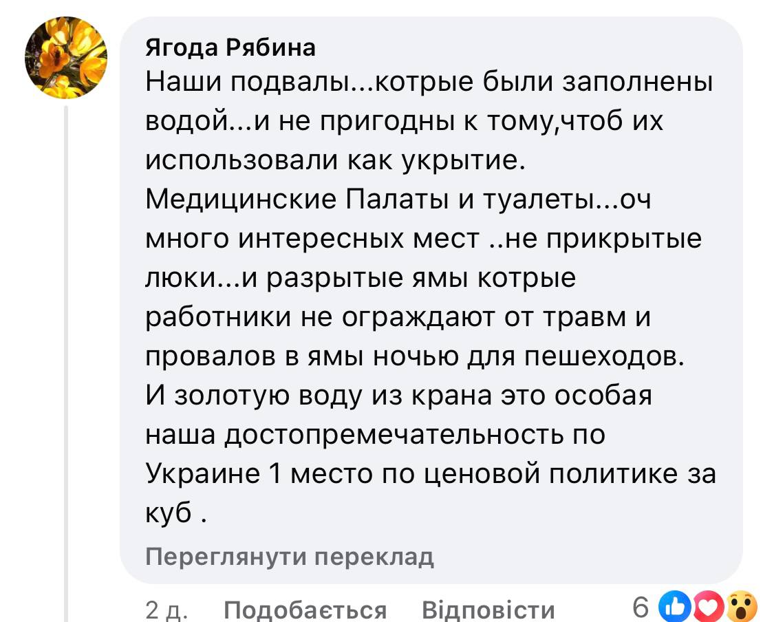 «Наші підвали, заповнені водою… не придатні для укриттів. А ще золотиста вода з крана – наша особлива пам’ятка. Перше місце в Україні за ціною за куб».