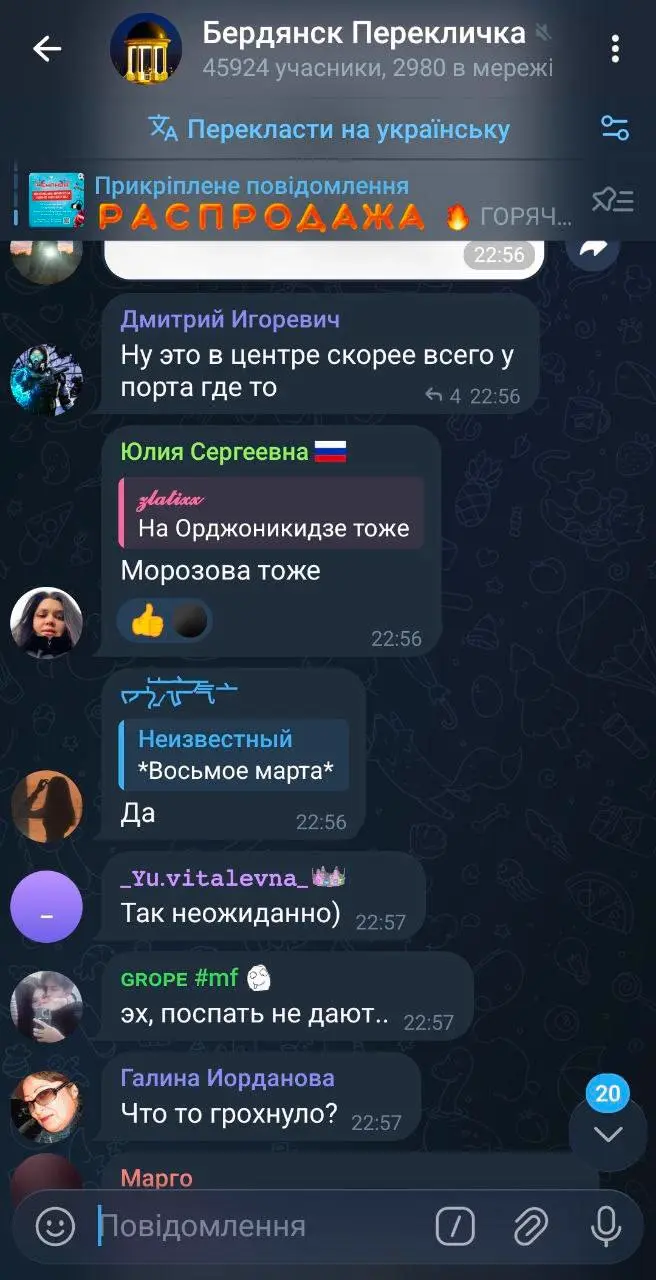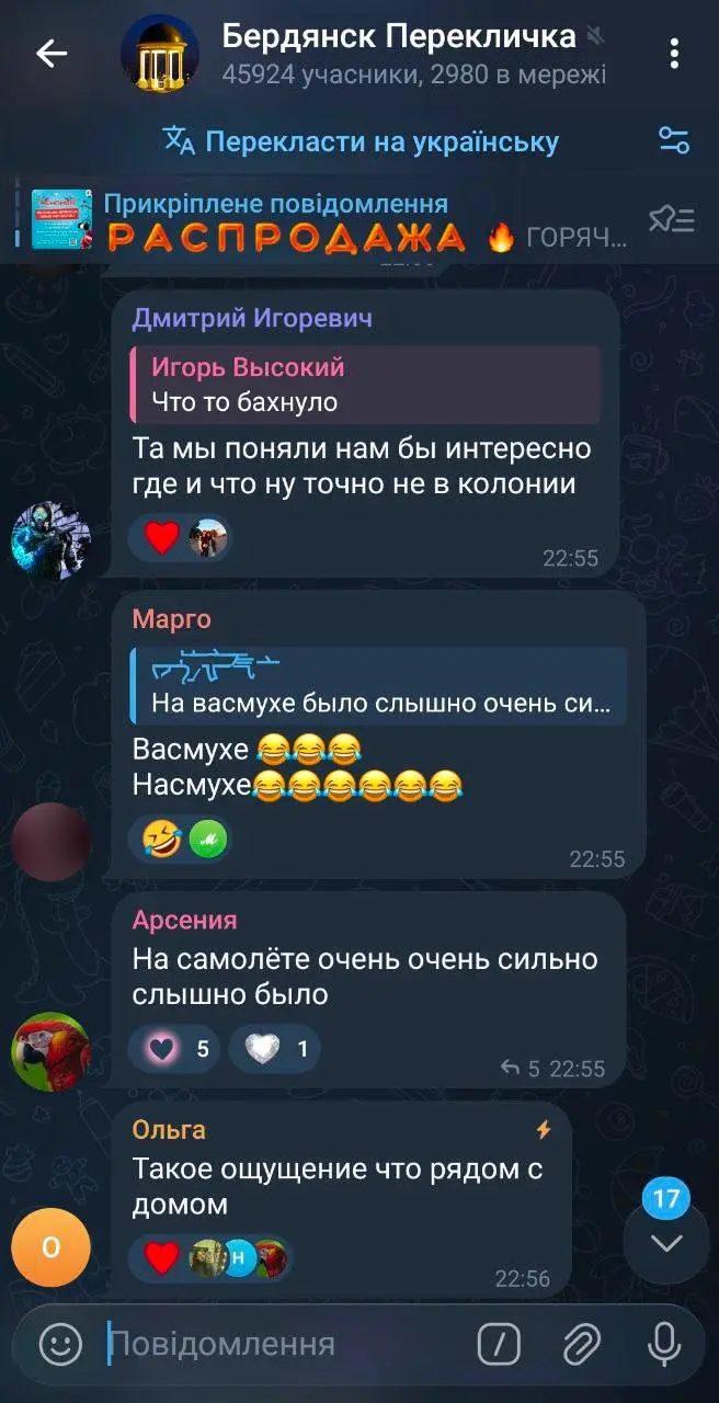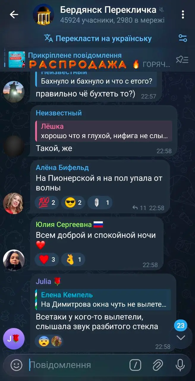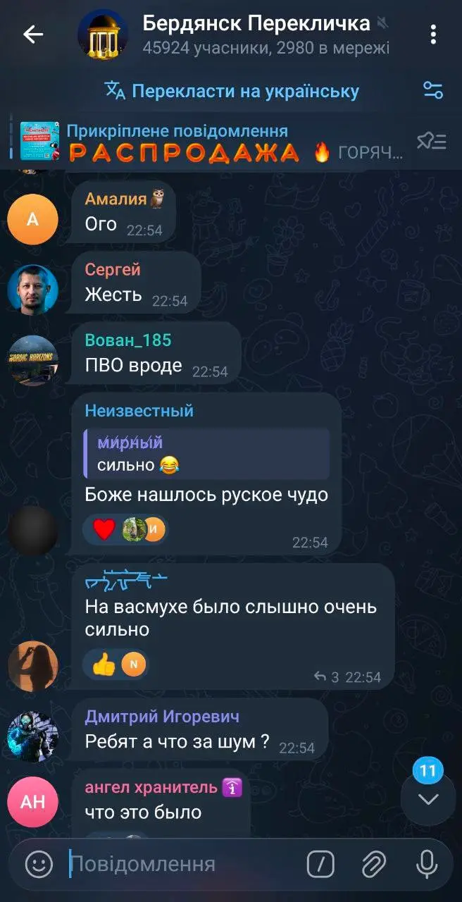 9 січня, 23:00. У тимчасово окупованому Бердянську, в ніч на сьогодні мешканці повідомляли про проліт безпілотників та роботу протиповітряної оборони російських військ безпосередньо над містом.