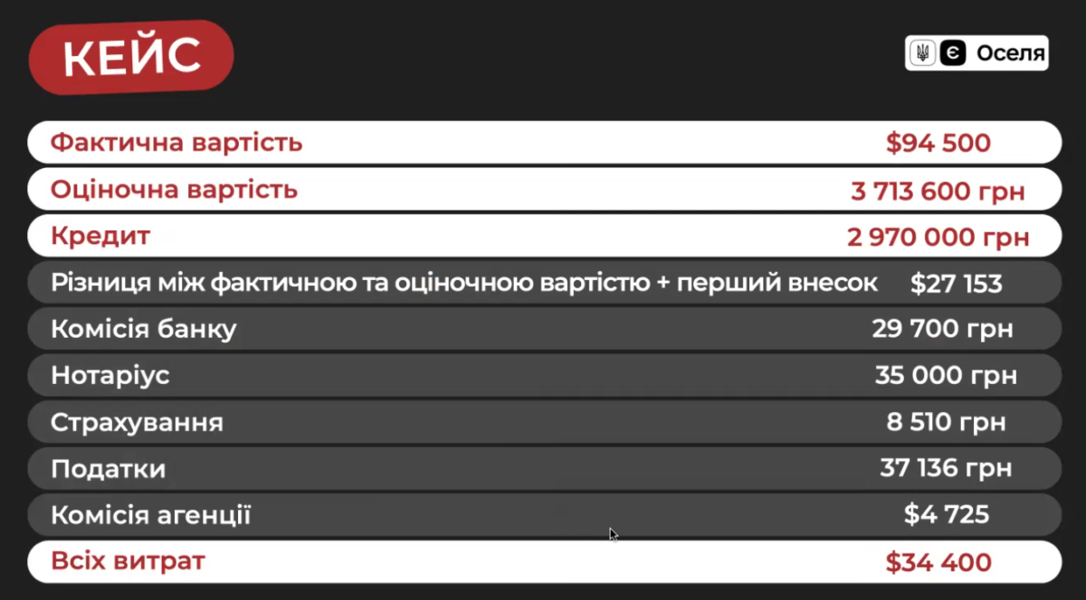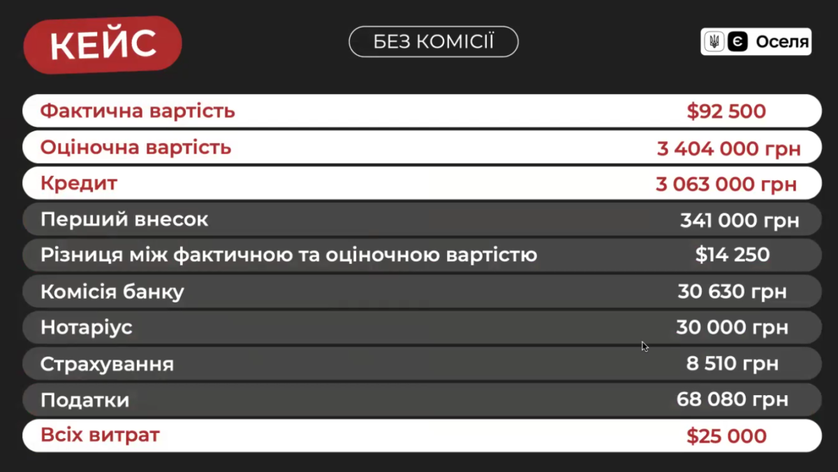 Якщо квартира чи будинок старше трьох років, то податки складають лише пару відсотків. Водночас слід враховувати, що між ціною продавця та оцінкою банка буде різниця, яку одразу треба компенсувати власнику. Також кредит може складати менше, ніж оцінювальна вартість нерухомості. Тож ця різниця з ціною стає ще більше. Новік пояснила, що під час оцінки банк не враховує ані вид з вікна, ані стан ремонту чи наявність побутової техніки.