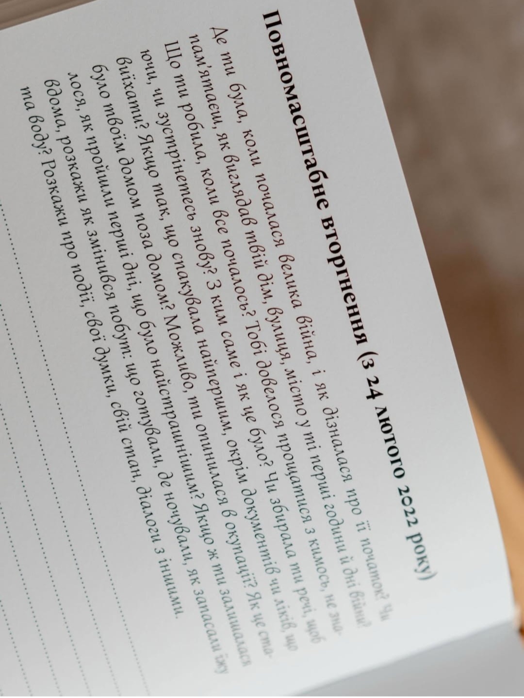 «Хлопець купив своїй мамі, яка вже старенька, вона його пізно народила. Він зараз не має дітей і найближчим часом не планує. Там є великий розділ про досвід бути бабусею та лист онукам. І я розумію, що для неї це чи не єдиний шанс реально щось їм сказати. Це аж до мурах по шкірі. У мене замовили один щоденник в Крим, а ще один в Канаду. Мама замовниці в окупації в Луганську, і вона буде по відеодзвінках заповнювати з її слів. Для мене це про можливість не втратити спогади про дитинство, пам’ять про місця, бо багато міст і будинків зруйновані, фотографії десь під завалами», – пояснили дівчина.