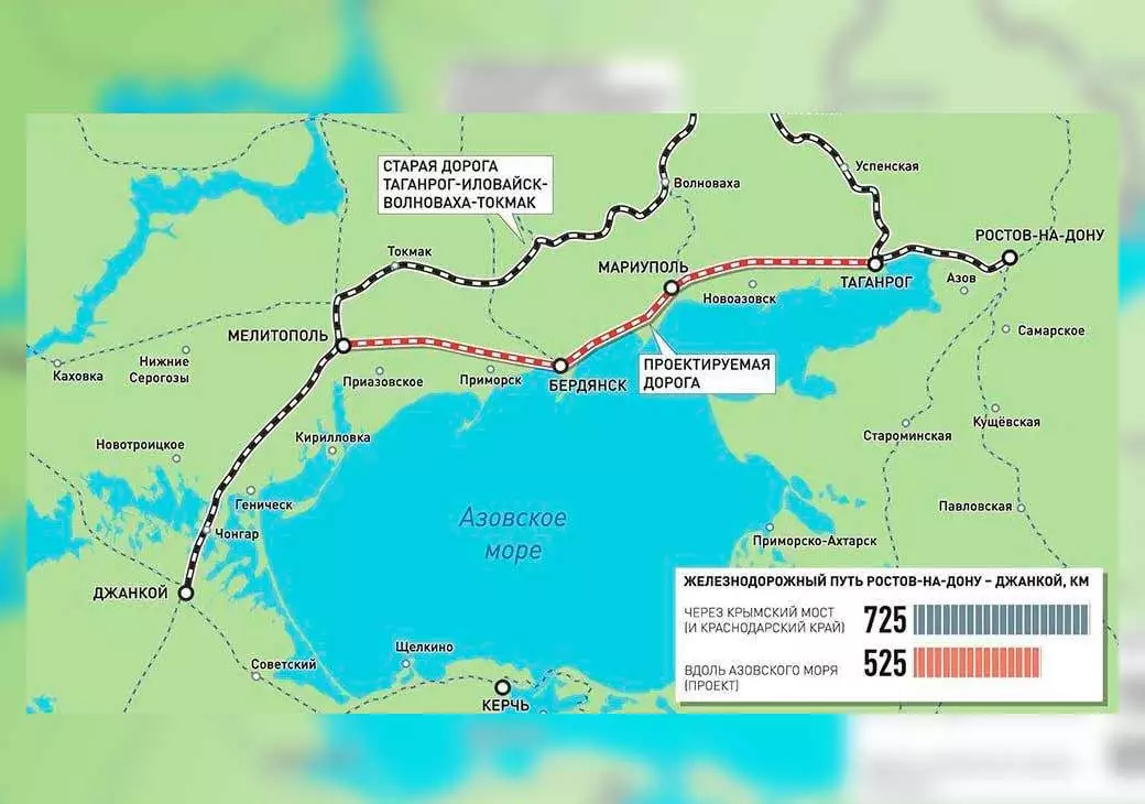 Заява про відновлення залізниці між Ростовом-на-Дону, окупованими Донецьком, Маріуполем та Бердянськом пролунала від диктатора ще минулого року. Нова залізниця має скоротити відстань між Ростовом та Кримом на 200 кілометрів. Але попри гучні заяви залізниця досі не запущена.