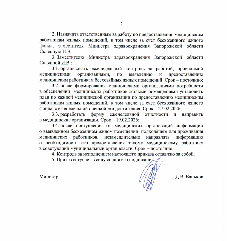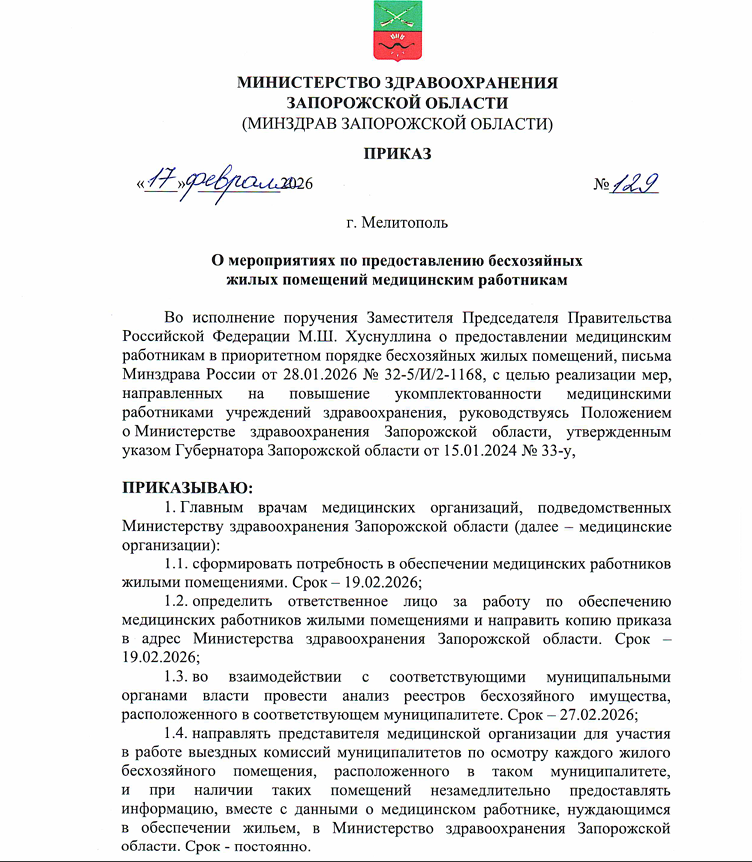 Голова уряду російської федерації Хуснуллін доручив надати безгосподарні житлові приміщення в пріоритетному порядку медичним працівникам. Протягом лютого керівники медзакладів мали з’ясувати скільки житла потрібно для їх працівників. Про це «Бердянськ 24» дізнався з наказу окупаційного міністерства охорони здоров’я Запорізької області.