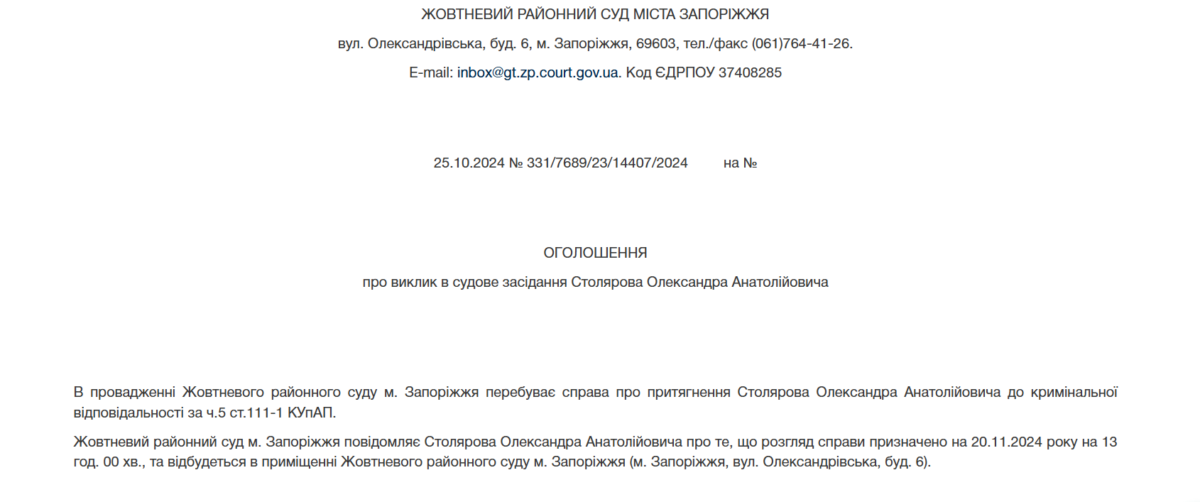 Олександрівський районний суд Запоріжжя. Визнав Олександра Столярова винним у колабораційній діяльності. Після затримання він проведе 9 років у в’язниці. Крім цього Столяров не має права обіймати будь-які посади, пов’язані з виконанням функцій держави та місцевого самоврядування, строком на 15 років.