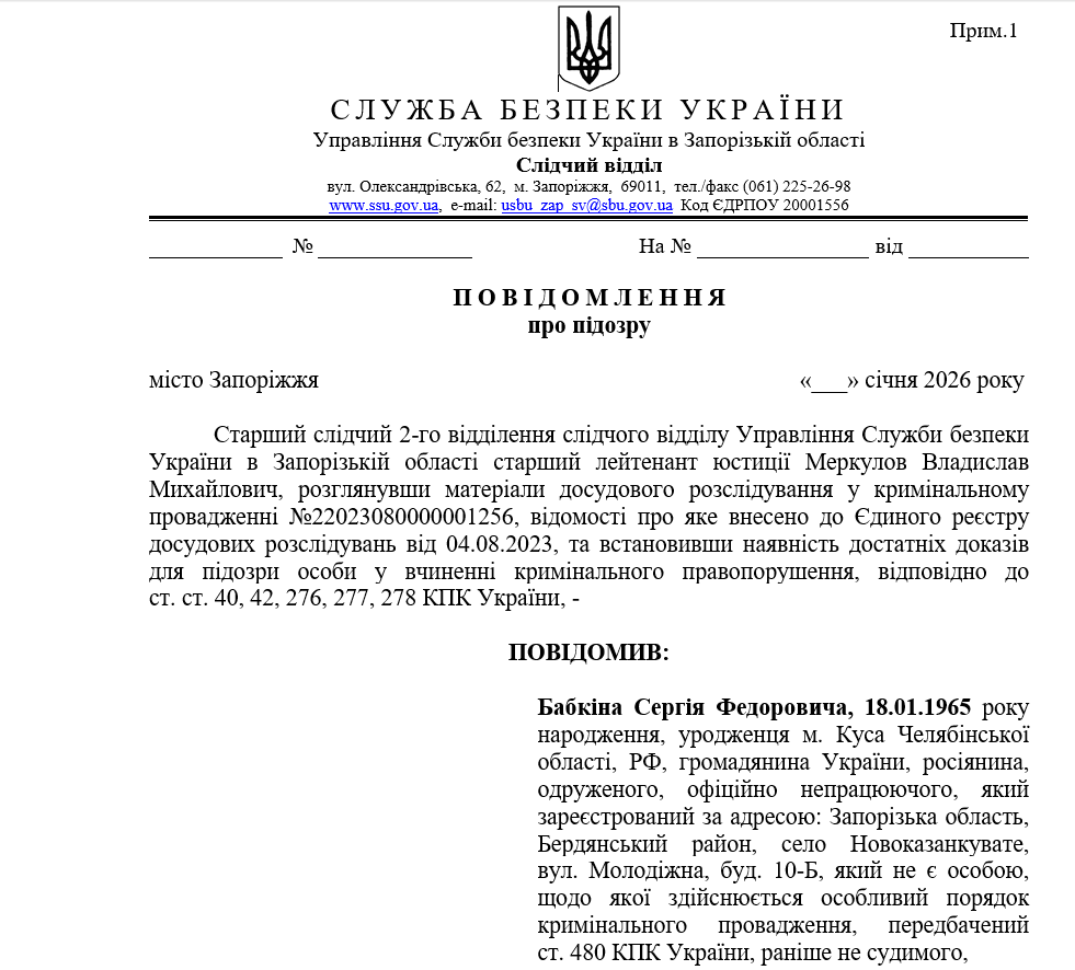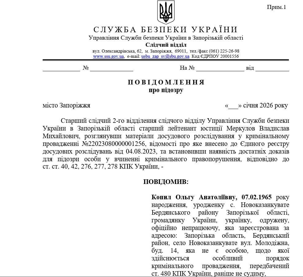 Слідство встановило, що з серпня по вересень 2023 року Ольга Копил і Сергій Бабкін умисно підтримали проведення незаконних виборів депутатів окупаційних Законодавчих зборів і муніципальних утворень. Жінку та чоловіка призначили членами дільничної виборчої комісії села Новоказанкувате в Чернігівській громаді Бердянського району. Про це «Бердянськ 24» дізнався з повідомлень про підозри.