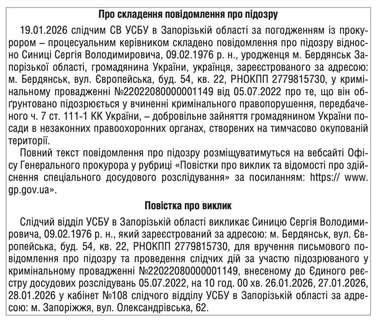 До слідчого викликають поліціянтів, які, за підсумками розслідування, добровільно зайняли посади в незаконному правоохоронному органі окупантів. Це жителі Бердянська та району, а саме Успенівки, Салтичиї, Берестового та Новопавлівки. Проти всіх порушили кримінальне провадження за ч. 7 ст. 111-1 КК України. Про це «Бердянськ 24» дізнався з Урядового кур’єру.