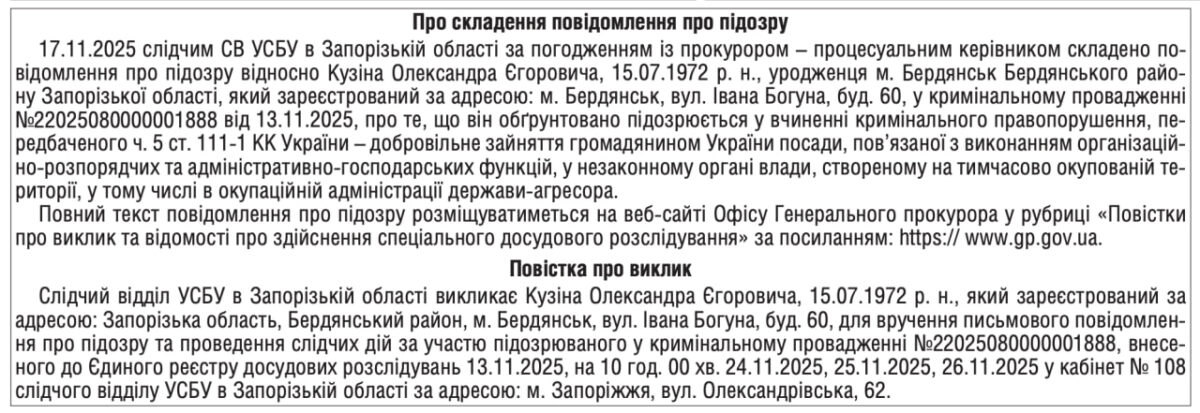 17 листопада цього року слідчі СБУ повідомили Олександру Кузіну про підозру в колабораційній діяльності. А саме за ч. 5 ст. 111-1 КК України – добровільне зайняття громадянином України посади, пов’язаної з виконанням організаційно-розпорядчих та адміністративно-господарських функцій, у незаконному органі влади, створеному на тимчасово окупованій території, у тому числі в окупаційній адміністрації держави-агресора. Про це «Бердянськ 24» дізнався з повістки, опублікованої на порталі «Урядовий кур’єр».