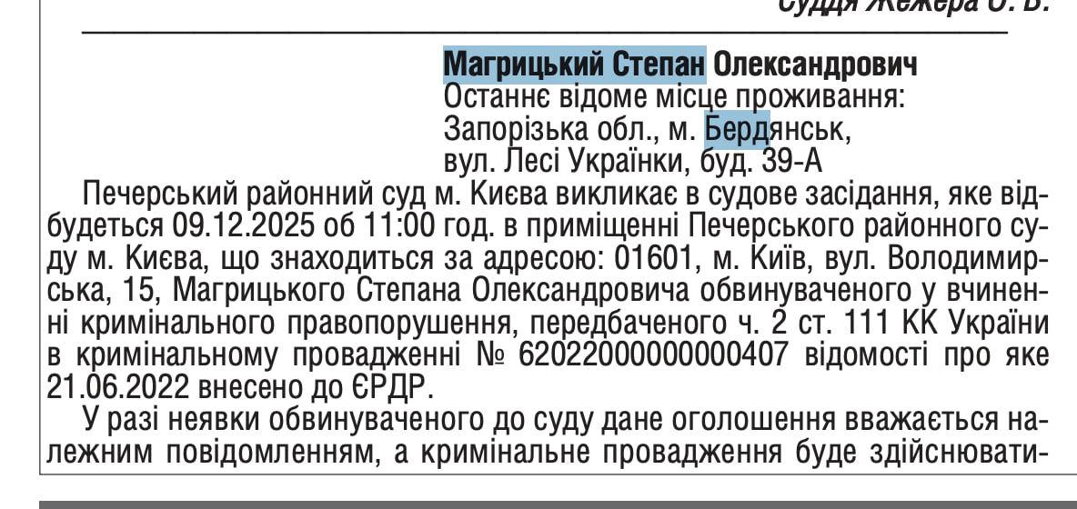 9 грудня в Києві відбудеться судове засідання у справі Степана Магрицького. Бердянця звинувачують у колабораційній діяльності. Про це «Бердянськ 24» дізнався з оголошення в «Урядовому кур’єрі».