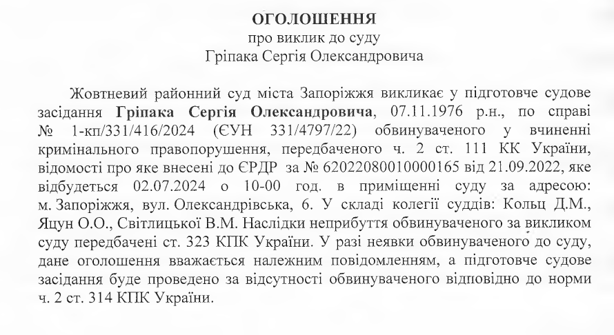 Олександрівський районний суд Запоріжжя визнав Сергія Гріпака винним у державній зраді. Його позбавили спеціального звання «майор поліції». Після фактичного затримання на бердянця чекає 15 років ув’язнення з конфіскацією майна. Також протягом трьох років він не має права обіймати посади в органах державної влади та охорони правопорядку.