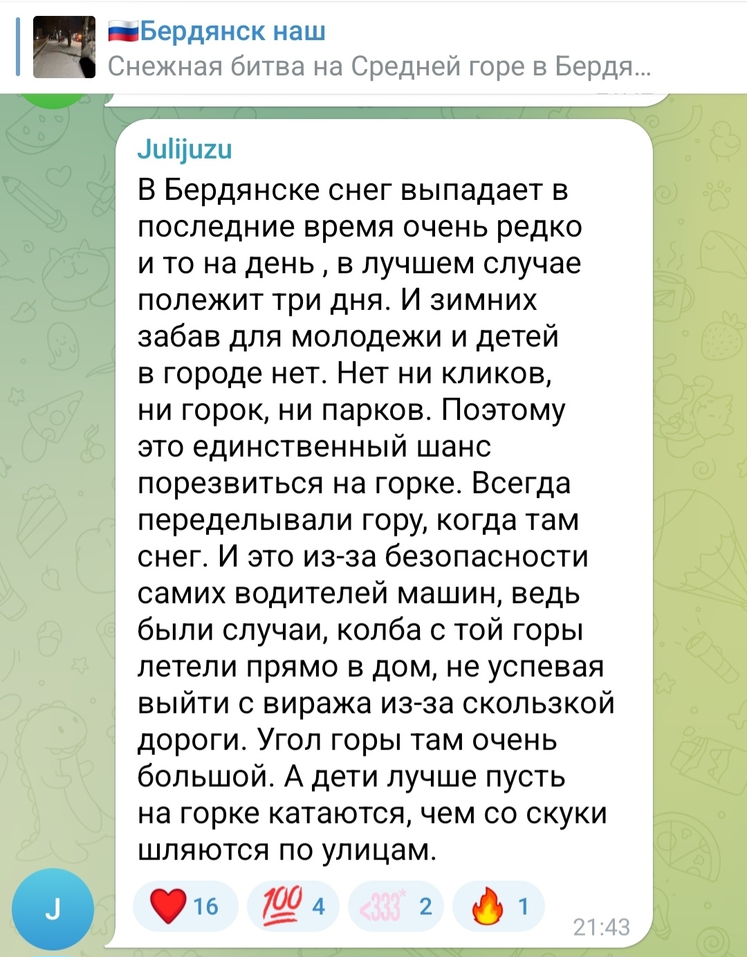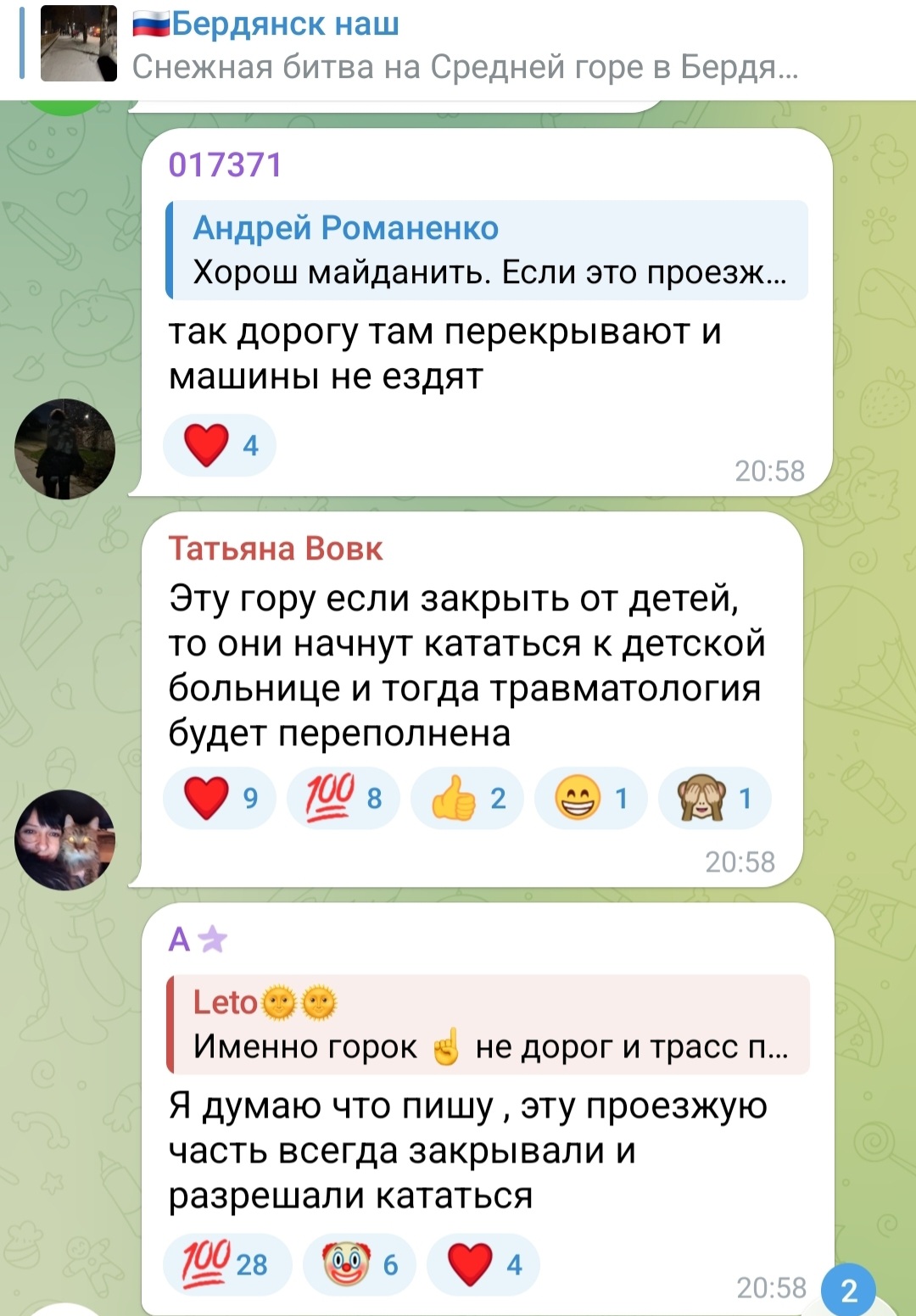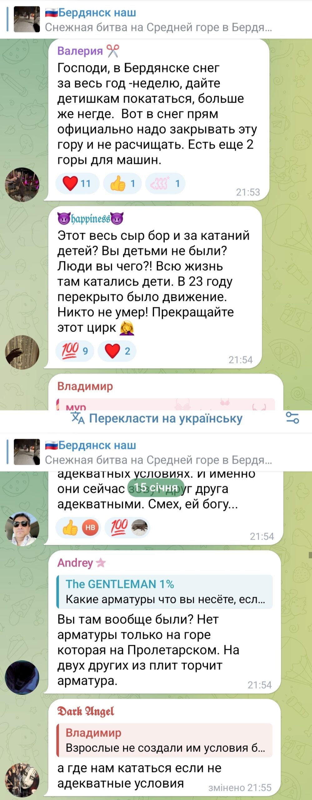 Цієї зими по всій Україні засніжило, так само морози дійшли до Бердянська. Ввечері 15 грудня місцеві мешканці разом з дітьми катались на санчатах з Середньої гори, але веселощі прервали комунальники. Велика машина заїхала на гору, щоб посипати її піском. Вочевидь, ані нові комунальники, ані окупаційна влада не знають, що в сніжну погоду цю дорогу завжди перекривали та вона ставала центром зимових розваг для всього міста.