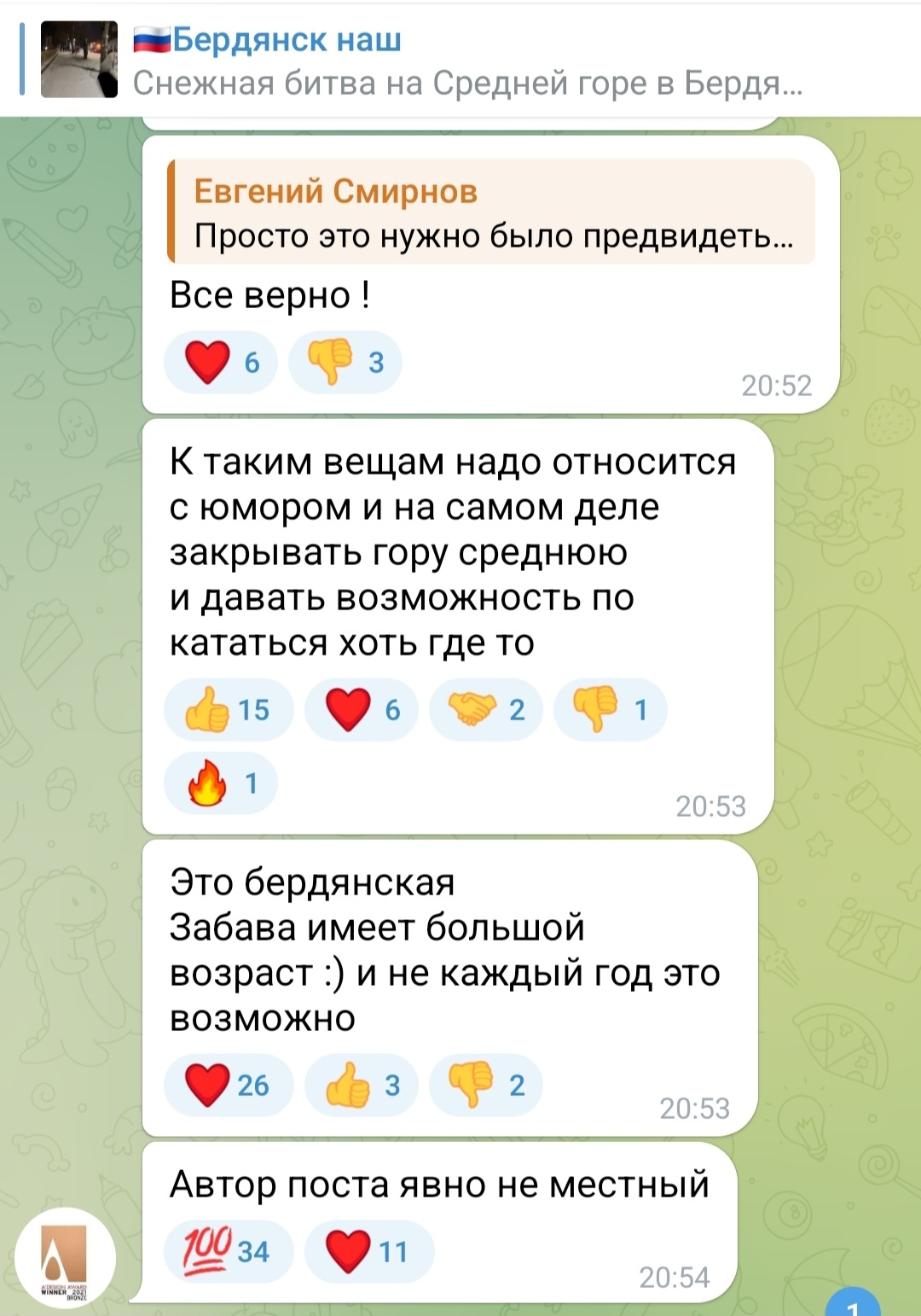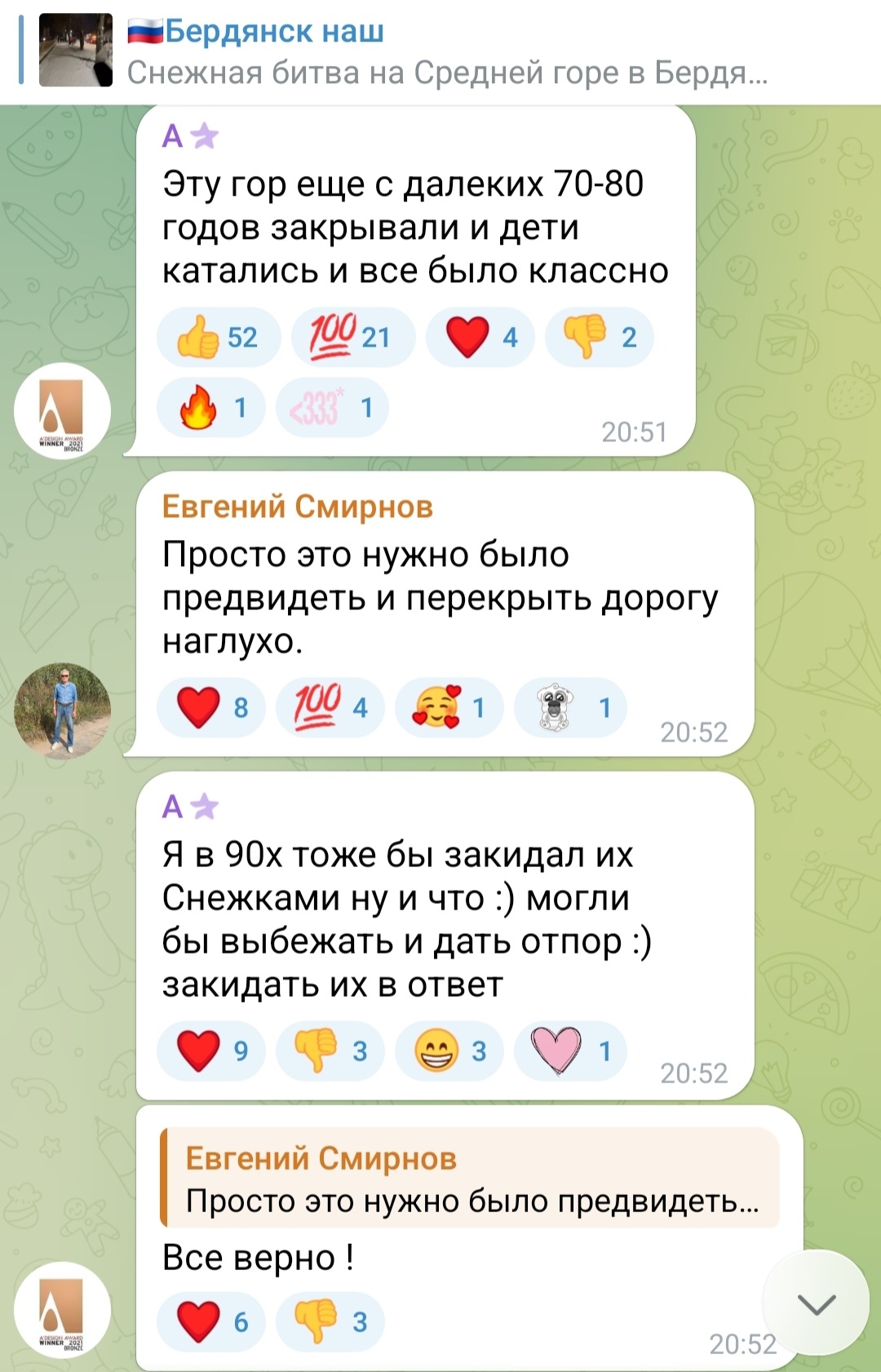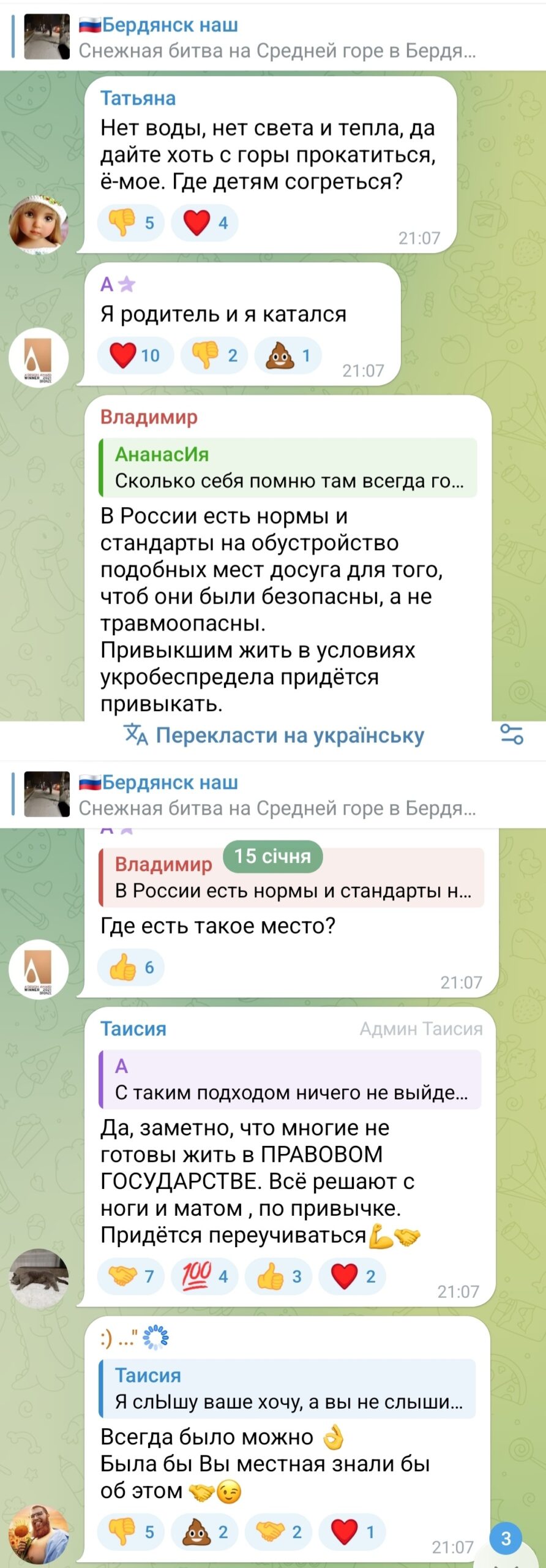 Цієї зими по всій Україні засніжило, так само морози дійшли до Бердянська. Ввечері 15 грудня місцеві мешканці разом з дітьми катались на санчатах з Середньої гори, але веселощі прервали комунальники. Велика машина заїхала на гору, щоб посипати її піском. Вочевидь, ані нові комунальники, ані окупаційна влада не знають, що в сніжну погоду цю дорогу завжди перекривали та вона ставала центром зимових розваг для всього міста.