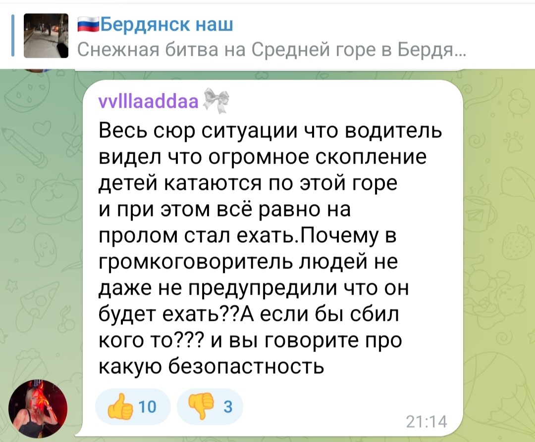 Діти вирішили захистити своє право спускатися на санчатах і закидали комунальне авто сніжками. Це начебто завадило продовжити посипку дороги. А батьки поскаржились на комунальників одному з пропагандистських медіа, адже вантажівка могла нашкодити дітям.