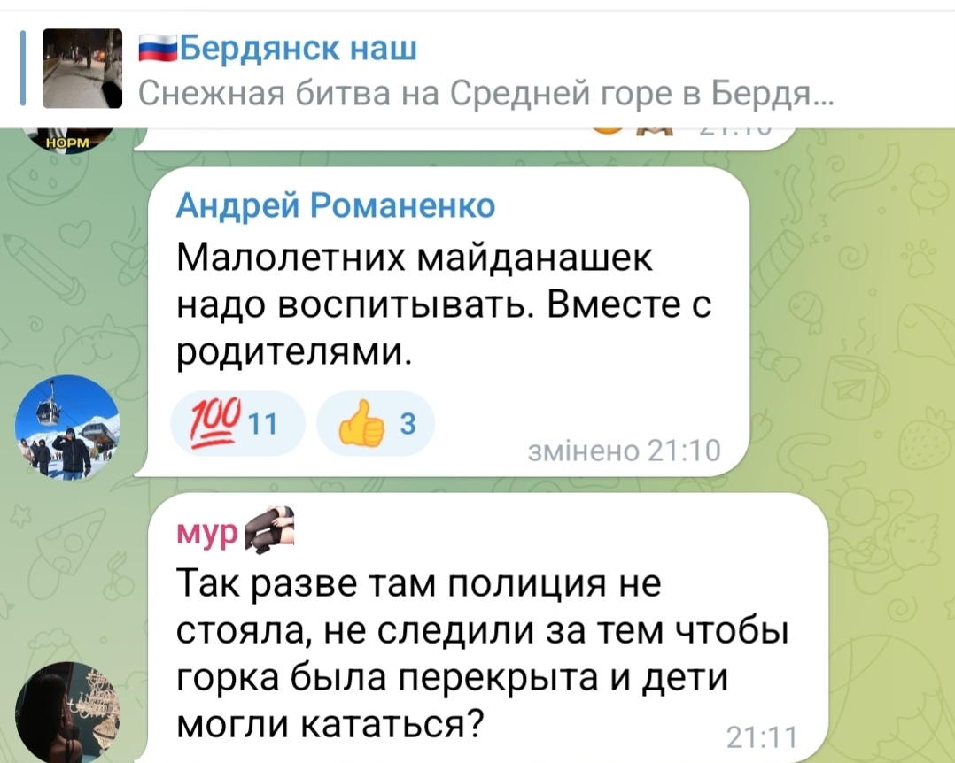 Медійники-пропагандисти відреагували на звернення батьків зустрічною критикою. На думку окупантів, дорога не місце для санчат, діти – хулігани, а їх батьки безвідповідальні. Прихильники «руського міра» обізвали українських дітей «малолітніми майданашками» та закликали залучити дитячу кімнаті міліції.