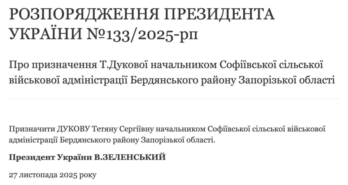 Президент України підписав два розпорядження, датовані 27 листопада 2025 року. Документ №132/2025-рп звільняє Станіслава Захаревича з посади начальника Софіївської сільської військової адміністрації Бердянського району.
