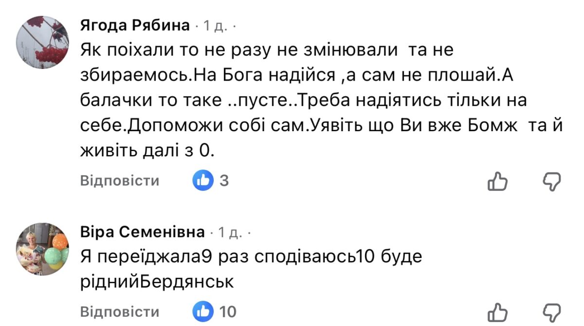 Ще одна бердянка Віра пише, що переїздила 9 разів, але не втрачає надію, що десятий раз буде останній до українського Бердянська.