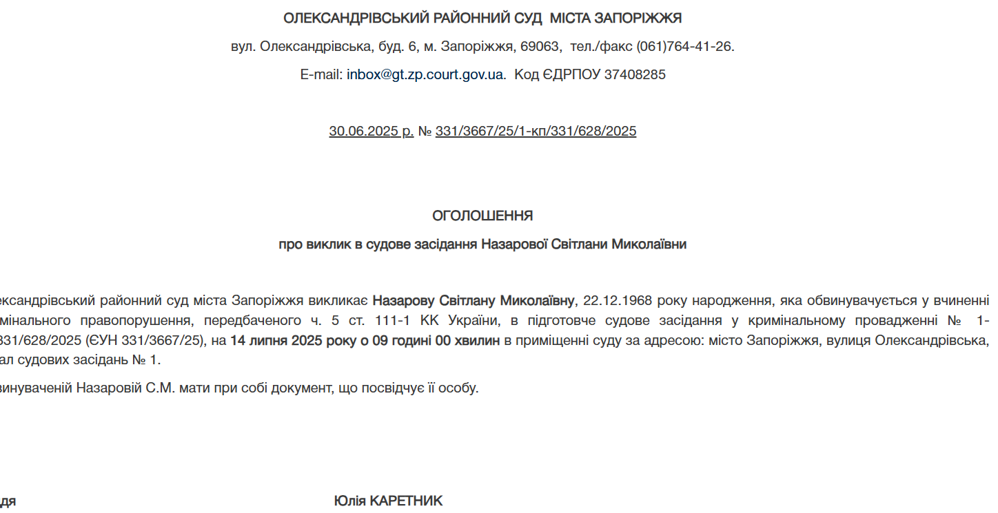 За даними слідства, Назарова добровільно зайняла посаду в.о. заступника начальника Бердянського управління соціального захисту при окупантах. Жінка перебуває на ТОТ, тож судові засідання проходили без її присутності. Про це «Бердянськ 24» дізнався з публікації на сайті Олександрівського районного суду Запоріжжя.