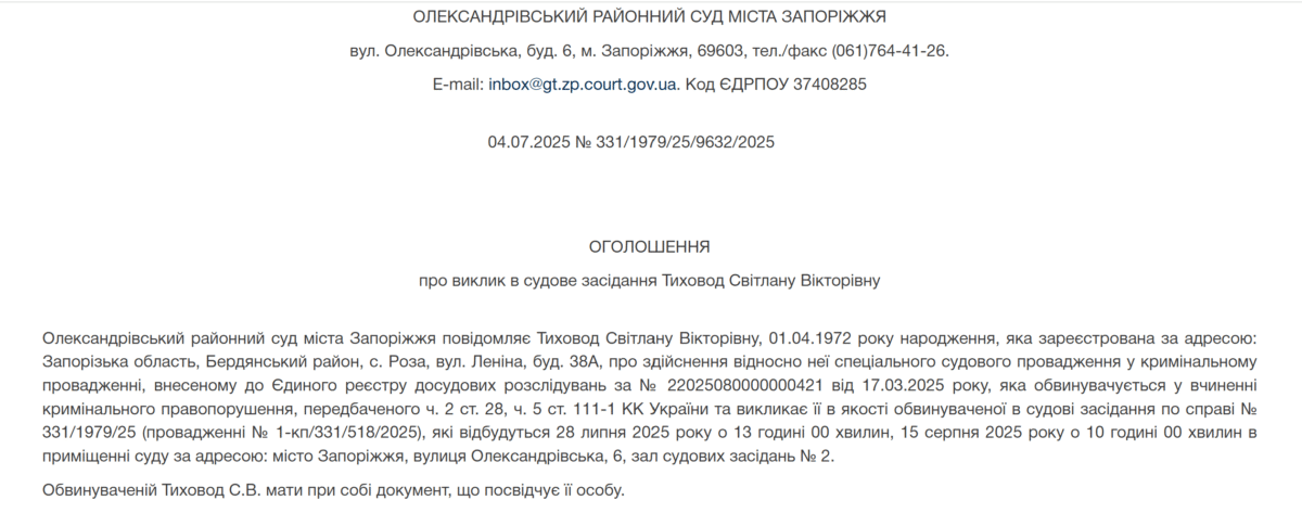 Слідство встановило, що Світлана Тиховод була членом виборчої дільниці окупантів. Жінка здійснювала подворовий обхід мешканців с. Роза зі скринькою для збору голосів та агітувала інших місцевих жителів приймати участь в голосуванні. Про це «Бердянськ 24» дізнався з публікцаії Олександрівського суду Запоріжжя.